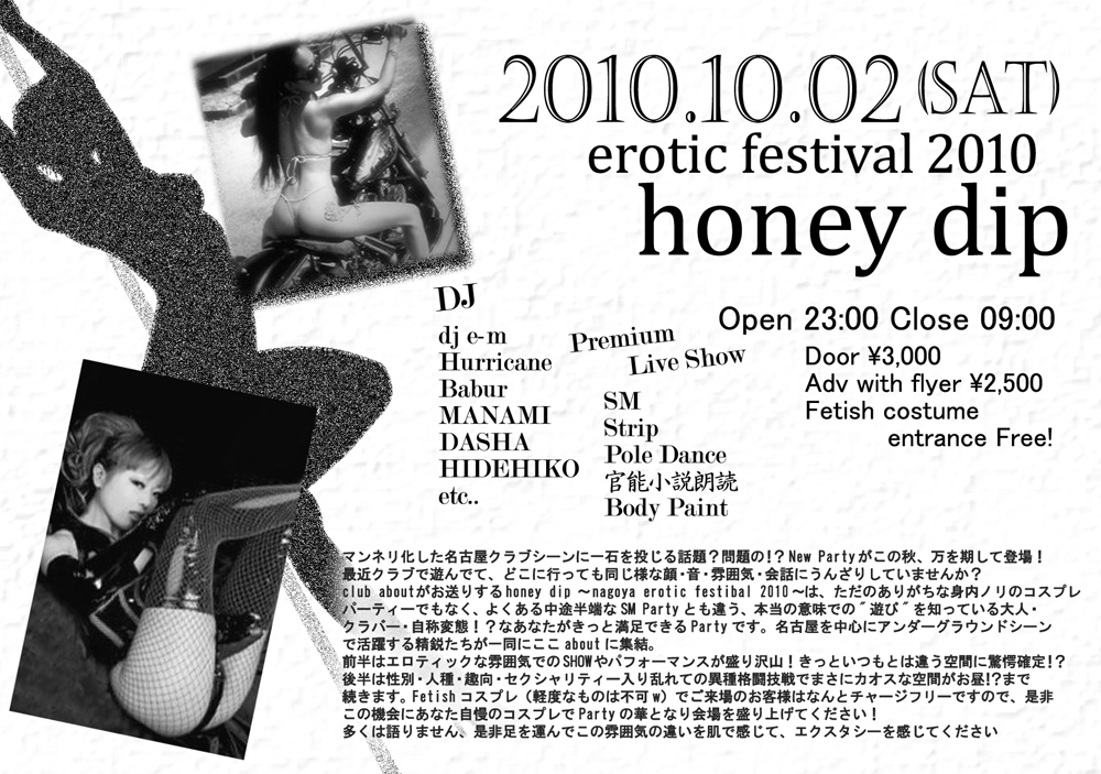 aboutがお送りするhoney dip 〜nagoya erotic festibal 2010〜は、ただのありがちな身内ノリのコスプレパーティーでもなく、よくある中途半端なSM