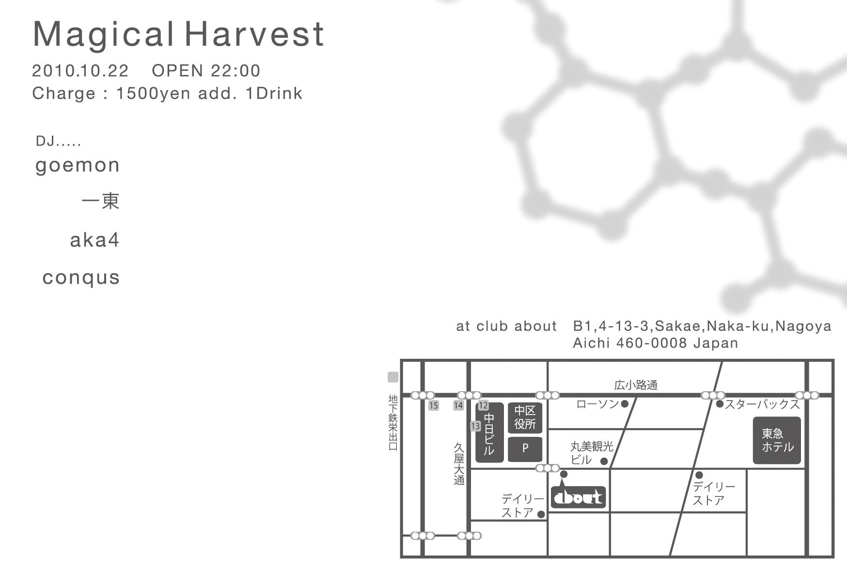 名古屋を中心にアンダーグラウンドシーンで活躍する精鋭たちが一同にここaboutに集結。前半はエロティックな雰囲気でのSHOWやパフォーマンスが盛り沢山!きっといつもとは違う空間に驚愕確定!?後半は性別・人種・趣向・セクシャリティー入り乱れての異種格闘技戦でまさにカオスな空間がお昼!?まで続きます。