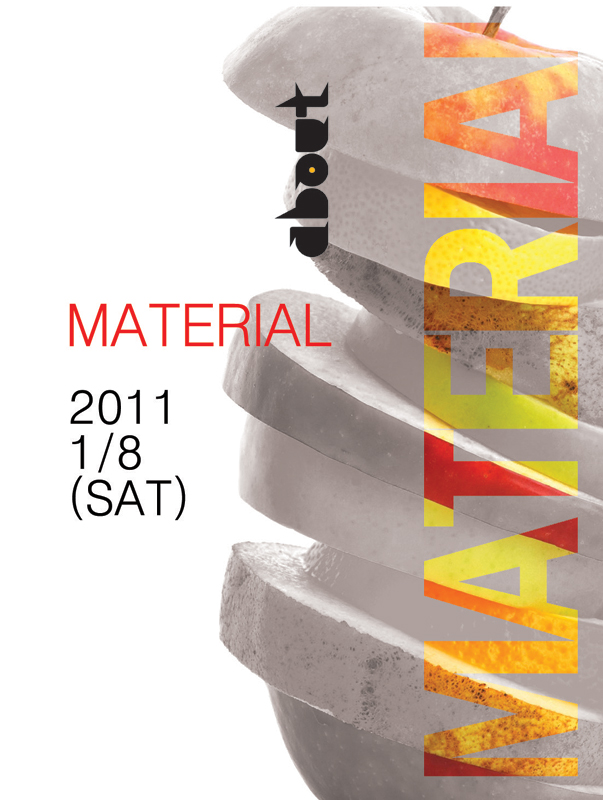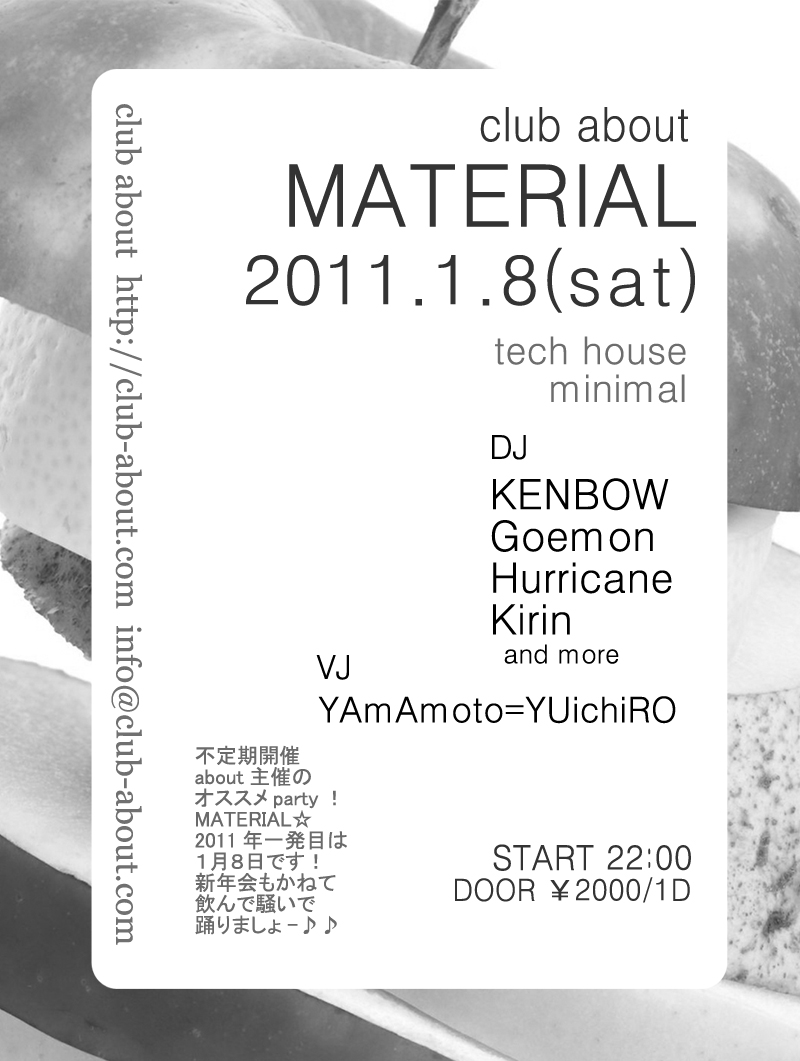 不定期開催!about主催のオススメparty『MATERIAL』 2011年一発目は、1月8日です! 新年会もかねて、飲んで騒いで踊りましょう♪