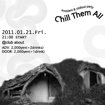 Chillout Selectors odoo (生煮会-namaniekai-/ニエキラNight/Chill Them All) KIYO a.k.a. Hurricane (about) きりん (about) うさ♂ (Metabolic Sound) EIJI (Chill Them All) 60x60x60 (Kong-Tong) Live/Manipulator Macrophage Lab. a.k.a. HIEI (COLONY Recordings) Acoustic Live EIJI <From MIE> Belly Dance IKI (Padma Surya) & Rica (Kanjo)