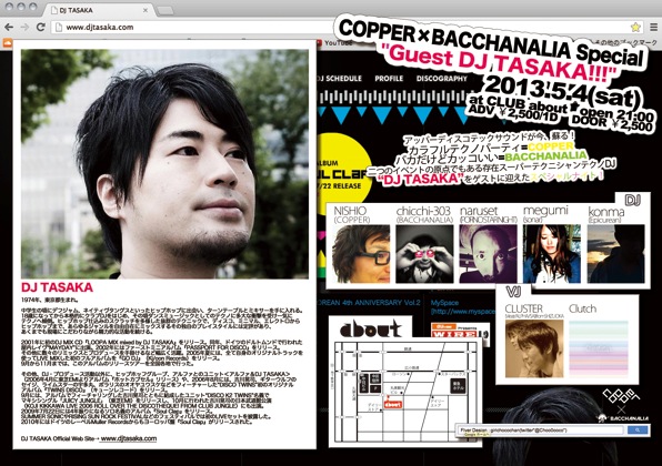 http://stickheadpress.tumblr.com/アッパーディスコテックサウンドが今、蘇る! カラフルテクノパーティ=COPPER バカだけどカッコいい=BACCHANALIA 二つのイベントの原点でもある存在 スーパーテクニシャンテクノDJ"DJ TASAKA"を ゲストに迎えたスペシャルナイト!