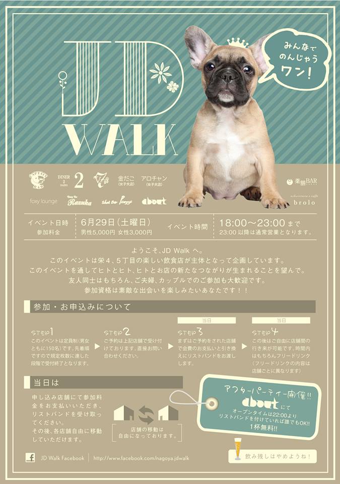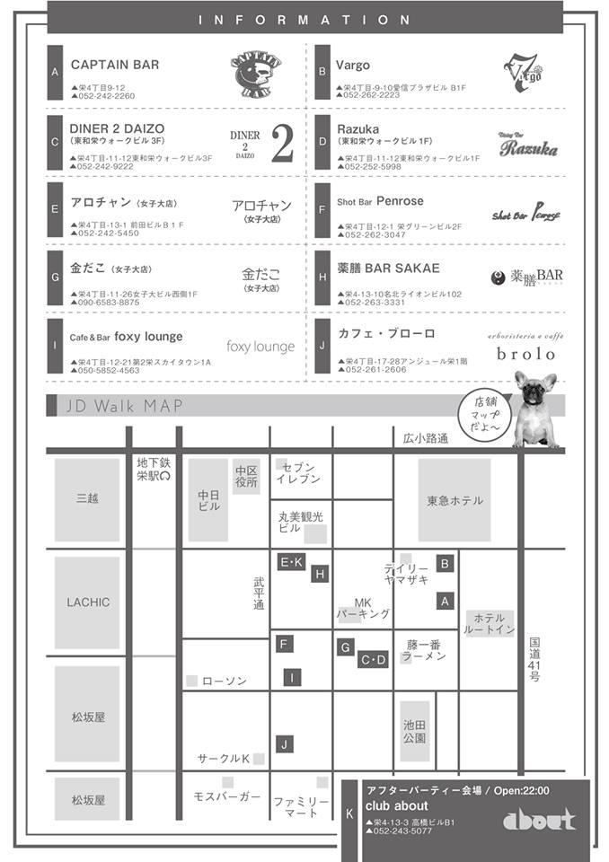 JD Walk がまたまたやってきます 今回は過去最多の11店舗が参加決定 オーセンティックなショットバー お洒落なカフェバー フードが豊富な居酒屋さん などなど 栄4丁目のnew open なお店も新たに加わって 素敵な夜を演出します 時間もたっぷり5時間 ゆったりまったりでもよし、 アクティブに全軒駆け巡るもよし 楽しみ方はあなた次第 チケットも350枚とこちらも過去最多 参加ご希望のお客様は、各店舗にて販売しております 直接お問い合わせください 規定枚数に達した段階で受付終了となりますのでお早めに