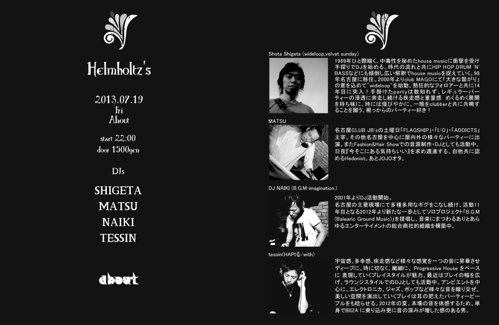 10年以上名古屋アンダーグラウンドハウスシーンの第一線で活躍しているベテランDJ Shigetaを始め、 実力派ハウスDJ MATSU・NAIKI チルアウト・アンビエントからの気持ち良い立ち上げを得意とするDJ Tessin about Presents良質ハウスパーティ!!