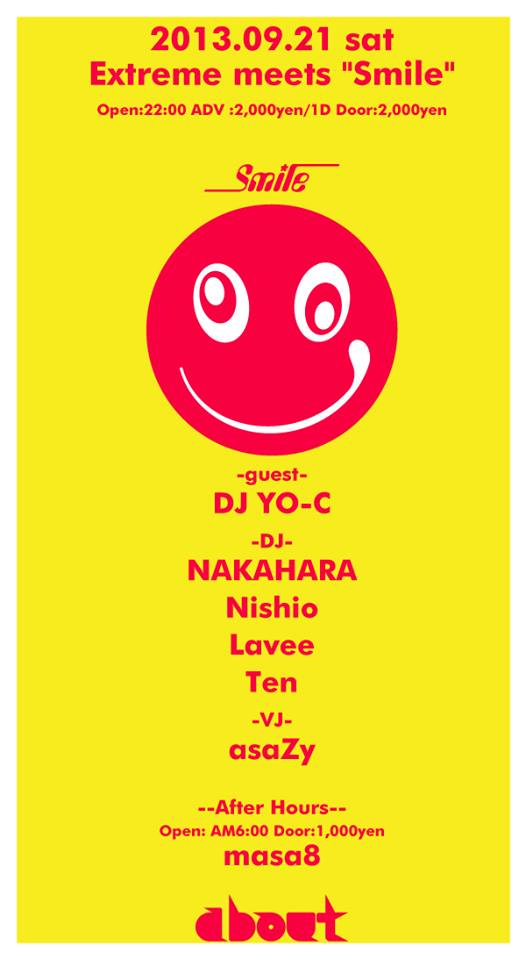 1993年から2005年までの12年間、常に世界レベルのパーティをプロデュースし、世界でもトップクラスのクラブともいえる地位を確立し伝説として語られるクラブ"MANIAC LOVE"のレギュラーパーティ"Smile"がMANIAC LOVE20周年を記念してここ名古屋aboutで1日限り復活!! ロンドン仕込みのテクニックとアッパーかつファンキーなDJスタイルでクラブミュージック界を魅了し続ける "DJ YO-C"と、RAINBOW2000・DISCOVERY等、今や伝説となった大型野外フェスや中国、上海、北京、韓国、はては地方の小さなCLUBでのPLAYまで、お祭り男として欠かせない存在である名古屋が誇る "DJ NAKAHARA" クラブミュージック全盛期の感動が蘇る!!