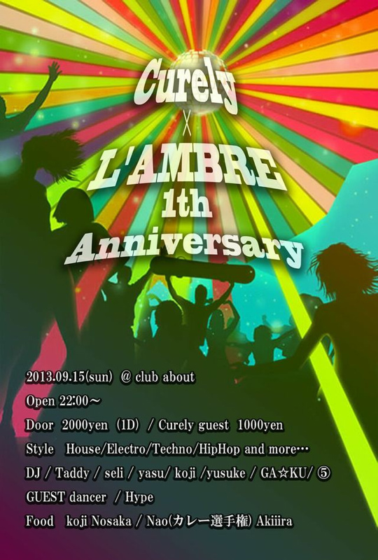 毎回大盛況のL'AMBREの一周年と美容室curelyの一周年を記念して合同パーティーを行います! 今回も豪華イケメン&美人DJ陣とSEXYなダンサーがフロアをもりあげます!!高山からゲストも呼んでますよ!! そして今回は第3回カレー選手権も開催します!我こそはというカレーの腕に自信のある方、歴代チャンピオン2人に勝負を挑んで下さい! 挑戦者求む!! ジャッジはお客さん次第! 今日という日は今日しかない♪ 残暑など吹き飛ばす勢いで、酒に、音に、出会いに、 皆で酔いしれましょう!!