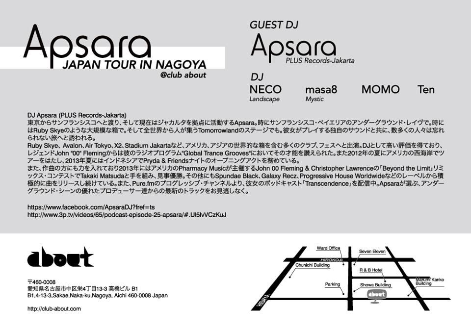 11/1はaboutにてジャカルタ在住の美人DJ/トラックメイカー、Apsaraが登場します!日本ではShin NishimuraさんのPlusに所属しています。Silk digitalからもリリースするように、テクノからプログレッシブまで網羅したプレイは必見! 今回のツアーではwomb,Airなどの他、名古屋、広島、宇都宮など各都市をまわりますよ!DosenやChristian Smith、Jaytech、Proffなんか好きな方は間違いないでしょう!