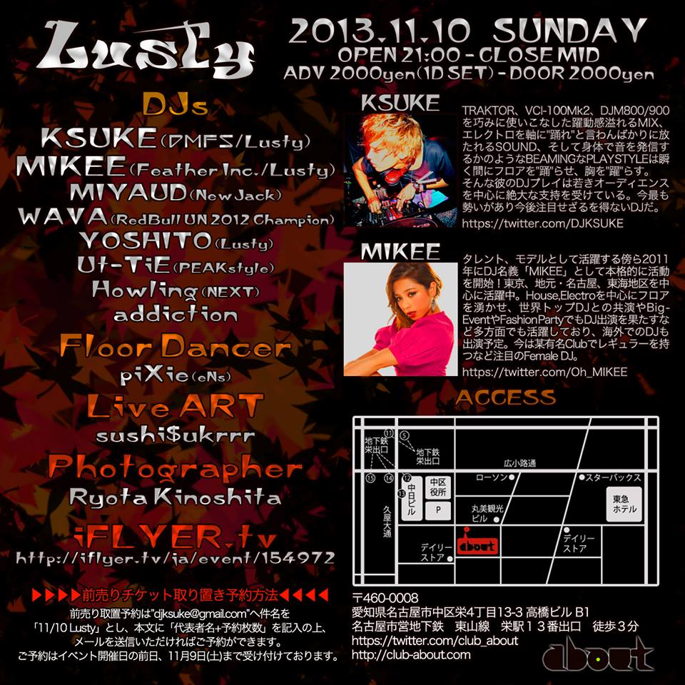 DJ KSUKE & MIKEEがMAIN ACTを務めるElectro Party Lusty! club aboutにて不定期に開催され、回を重ねるごとに爆発的な盛り上がりを見せている。 4月に行われた1st Anniversaryに引き続き7月に行われたLustyも超満員。 エレクトロに包まれ、日曜日とは思えない盛り上がりを魅せた。 Electro Partyとして勢いが止まらいLustyを是非体感しにお越しください!!