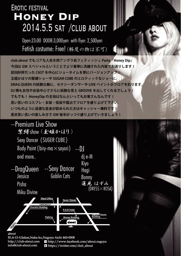 club aboutでもコアな人気を誇る アングラ系フェティッシュParty「Honey Dip」 今回はGWスペシャルということでより豪華に洗練された内容でお送りします! 前回好評だったCASTを中心にショータイムを更にバージョンアップ☆ 玉姫かほりの緊縛ショーや SUGAR CUBEのエロティックなショーに、 DRAG QUEENの妖艶な舞に、 セクシーダンサーやLIVEペイントがフロアを彩ります。 DJ陣も女性や女装中心でさらに妖艶な音とGROOVEを出してくれるでしょう! でもでも! HoneyDipの主役はなんといってもお客さんなんです!思い思いのコスプレ・女装・仮装や露出でフロアを盛り上げて下さい。 いつものように過激な変身が認められた方はキャッシャー無料です! 是非思い思いの楽しみ方でGW後半がっつり盛り上げていきましょう!