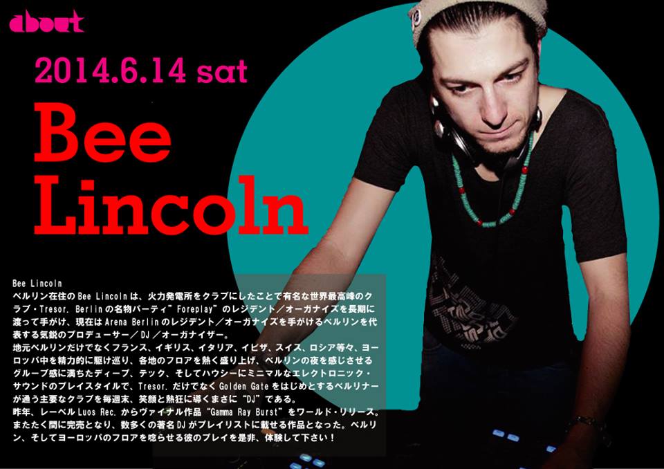 ベルリン在住のBee Lincolnは、火力発電所をクラブにしたことで有名な世界最高峰のクラブ・Tresor. Berlinの名物パーティ”Foreplay”のレジデント/オーガナイズを長期に渡って手がけ、現在はArena Berlinのレジデント/オーガナイズを手がけるベルリンを代表する気鋭のプロデューサー/DJ/オーガナイザーだ。 地元ベルリンだけでなくフランス、イギリス、イタリア、イビザ、スイス、ロシア等々、ヨーロッパ中を精力的に駆け巡り、各地のフロアを熱く盛り上げ、ベルリンの夜を感じさせるグルーブ感に満ちたディープ、テック、そしてハウシーにミニマルなエレクトロニック・サウンドのプレイスタイルで、Tresor.だけでなくGolden Gateをはじめとするベルリナーが通う主要なクラブを毎週末、笑顔と熱狂に導くまさに“DJ”である。 昨年、レーベルLuos Rec.からヴァイナル作品“Gamma Ray Burst”をワールド・リリース。またたく間に完売となり、数多くの著名DJがプレイリストに載せる作品となった。ベルリン、そしてヨーロッパのフロアを唸らせる彼のプレイを是非、体験して下さい!