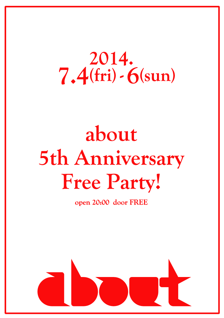 7月1週目の金・土・日 3日間は、 about5周年Free Party です☆ 5年間、楽しく続けてこれたのも皆様のおかげです。 本当にありがとうございます!! 当初5周年パーティは、 岐阜のキャンプ場での開催予定でしたが、 場所側の都合で急遽aboutでの開催になりました。 野外パーティを楽しみにしていた 皆様にはご迷惑おかけしました。 今週末、金・土・日 3日間は、 Free Partyでは、ありえない豪華メンバーで 楽しい夜になる事間違いなしです! 是非お友達をお誘いの上、 遊びに来て頂けるとうれしいです。