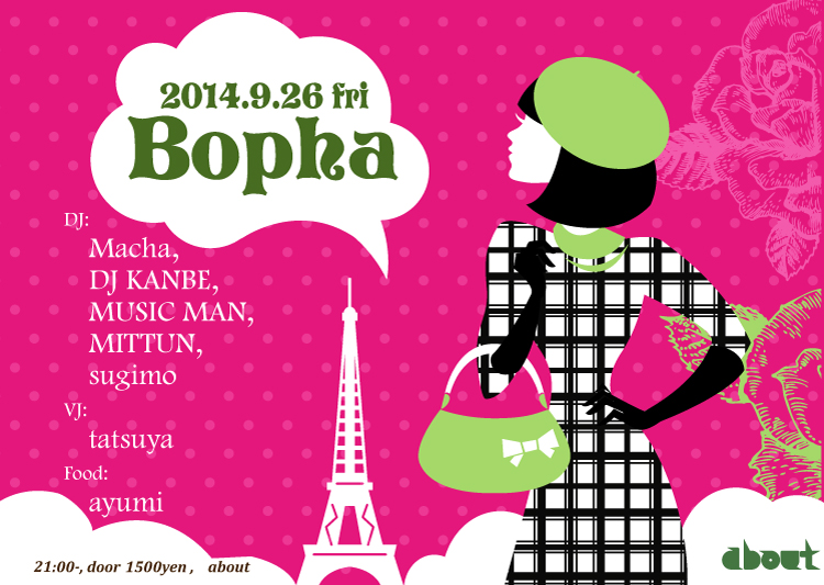 【Bopha=花】 club aboutで定期開催中のハウスパーティー。 中堅〜ベテランDJ陣による、味のある選曲とDJを堪能できます。