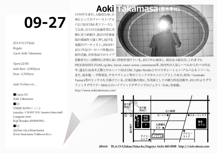 来週月曜日から木曜日の朝まで荷物の整理やなんだかんだのために名古屋に戻ります。 そんな中9/3(水)名古屋最後の夜にaboutさんのご厚意で夜20:00頃からaboutにて、 もーりーakaもりりんと二人で1:00頃までDJやらせていただく事になりました! 山口への移住が急にきまったためみなさんに会って回ることも出来てないので この機会みんなの顔を見れたらと思っていますのでご足労おかけしますが来て頂けたら 幸いです!