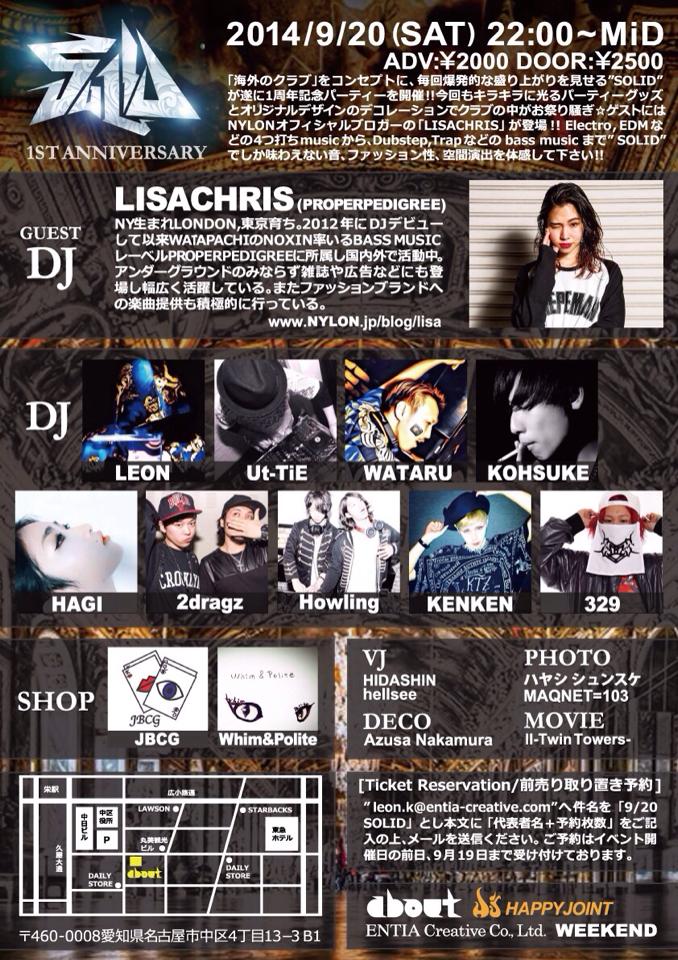 「海外のクラブ」をコンセプトに、毎回爆発的な盛り上がりを見せるSOLIDが遂に1周年記念パーティーを開催!! 今回もキラキラに光るパーティーグッズとオリジナルデザインのデコレーションでクラブの中がお祭り騒ぎ☆ ゲストにはナイロンオフシャルブロガーの「LISACHRIS」が登場!! Electro,EDMなどの4つ打ちmusicから、Dubstep,Trapなどのbass musicまで、SOLIDでしか味わえない音、ファッション性、空間演出を体感して下さい!!