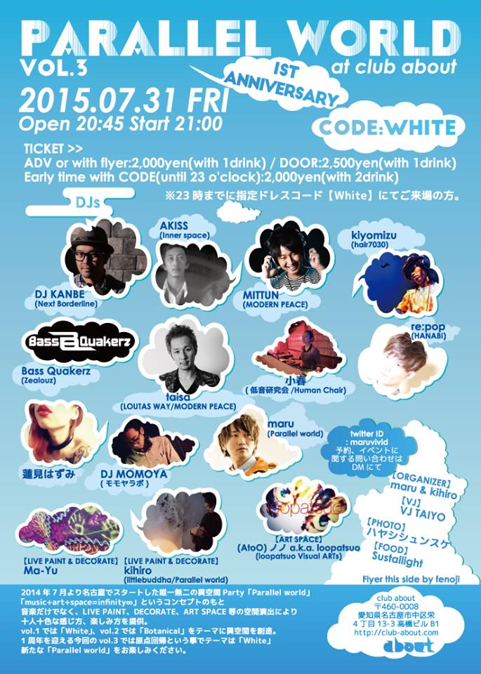 2014年7月より名古屋でスタートした唯一無二の異空間Party「Parallel world」。 「music+art+space=infinity∞」というコンセプトのもと 音楽だけでなく、LIVE PAINT、DECORATE、ART SPACE等の空間演出により 十人十色な感じ方、楽しみ方を提供。 vol.1では「White」、vol.2では「Botanical」をテーマに異空間を創造。 1周年を迎える今回のvol.3では原点回帰という事でテーマは「White」。 新たな「Parallel world」を是非ともお楽しみください。