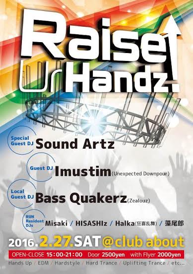 名古屋発Hands Upパーティ『Raise Ur Handz!』遂に始動開始!初回Special Guestとして国内外問わず絶大な人気を誇るHands Upクリエイター「Sound Artz」が登場!更には、国内Hands Upシーンの最前線で活躍するUnexpected Downpour主催のハンズアップおじさんこと「Imustim」が名古屋初登場!そして名古屋からは、言わずと知れたTaber a.k.a. Hardshufflerと、DJ Ya-tomoからなるHardstyle B2B DJユニット「Bass Quakerz」が参戦!Hands Upを主軸にHardstyleやEDMも堪能できるRUH、Hands Uperはもちろんのこと、様々なClub Musicファンが楽しめること間違いなし!是非お見逃しなく!!!