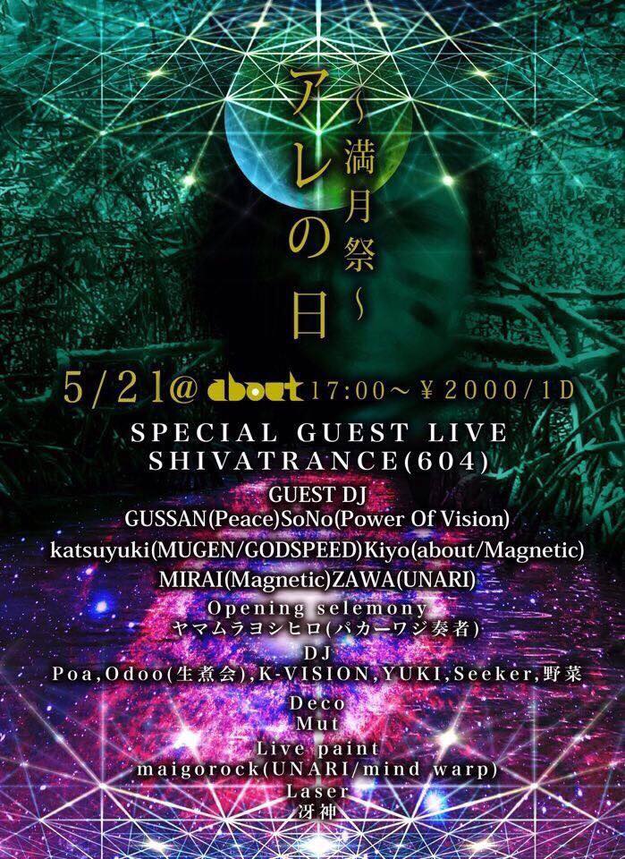 20160522アレの日が1周年を迎えます! 1年間継続出来たのも、遊びに来てくれるお客さん、毎回快く場所を提供してくれるabout、サポートしてくれる共演者、産んでくれた両親、いつも隣で支えてくれるパートナー、僕に関わるすべての人のお陰だと思っています。 この感謝の気持ちを少しでもシェア&恩返し出来たらと思い周年満月祭なるものを行います! この1年間で一目惚れをした最高のArtist,Djの方々が祝いに駆けつけてくれます!!アレの日をさらに盛り上げて脳みそが溶けてしまう事間違いなしの1日になるでしょう!! 体調を万全に整えて、体がはちきれるぐらい踊り尽くして、あと残るは魂だけになっちゃうくらい楽しみましょう♪ なお、FBで参加表明して頂いた方は ¥1500/1Dで入場していただけますのでぜひご活用下さい!