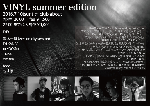 クラブ・ジャズ・ユニットversion city sessionでの活動、幅広い選曲でおなじみレコード・ショップmaterialのオーナー鈴木 一彰さん、そして2度目の出演、名古屋が誇るパーティーピーポーDJ KANBEをお招きし、一足先に夏を感じさせる曲をジャンルレスでお届けできたらと思ってます。