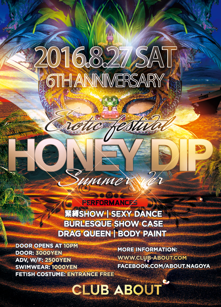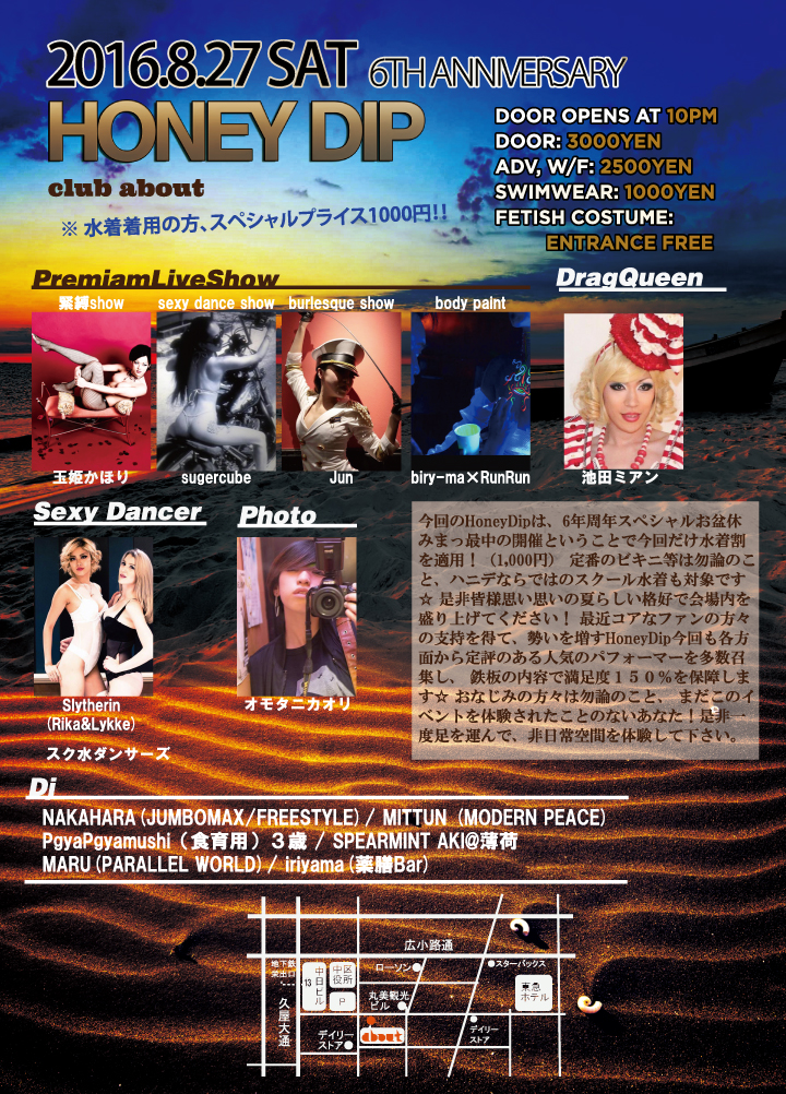 今回のHoneyDipは、summer ver. 6周年スペシャルということで今回だけ水着割を適用!(1,000円) 定番のビキニ等は勿論のこと、ハニデならではのスクール水着も対象です☆ 是非皆様思い思いの夏らしい格好で会場内を盛り上げてください! 最近コアなファンの方々の支持を得て、勢いを増すHoneyDip今回も各方面から定評のある人気のパフォーマーを多数召集し、 鉄板の内容で満足度150%を保障します☆ おなじみの方々は勿論のこと、 まだこのイベントを体験されたことのないあなた!是非一度足を運んで、非日常空間を体験して下さい。