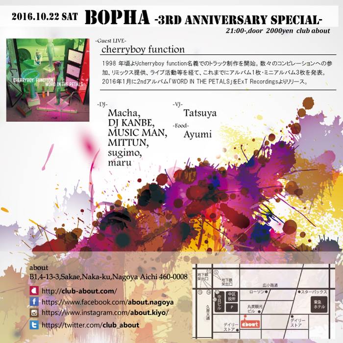 1998 年頃よりcherryboy function名義でのトラック制作を開始。数々のコンピレーションへの参加、リミックス提供、ライブ活動等を経て、これまでにアルバム1枚・ミニアル バム3枚を発表。2016年1月に2ndアルバム「WORD IN THE PETALS」をExT Recordingsよりリリース。