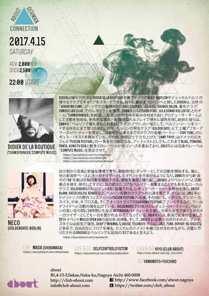 ドイツ、イギリス、デンマーク、スイス、中米、キプロス島、オーストラリア等、世界中を飛び回り、Fusion Festivalhttp://fr.traxmag.com/es/article/32987-will-the-fusion-festival-2017-be-cancelled、SubSonic Festivalhttp://www.subsonicmusic.com.au/等のビックフェスでプレイ、ベルリンの名立たるクラブでのプレイ・オーガナイズも勤め、 ワールドワイドへと活動の場を広げているドイツ在住、新潟出身、彼の嫁さんのDJ NECOさん、大変な中ですが出演して頂ける事になりました!!