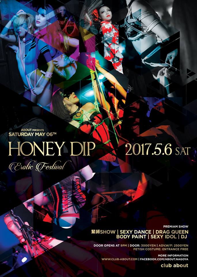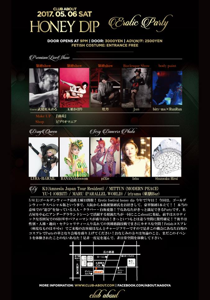 本当の意味での"遊び"を知っている大人・クラバー・自称変態!?なあなたがきっと満足できるPartyです。名古屋を中心にアンダーグラウンドシーンで活躍する精鋭たちが一同にここaboutに集結。前半はエロティックな雰囲気でのSHOWやパフォーマンスが盛り沢山!きっといつもとは違う空間に驚愕確定!?後半は性別・人種・趣向・セクシャリティー入り乱れての異種格闘技戦でまさにカオスな空間!Fetishコスプレ(軽度なものは不可w)でご来場のお客様はなんとチャージフリーですので是非この機会にあなた自慢のコスプレでPartyの華となり会場を盛り上げてください!おなじみの方々は勿論のこと、まだこのイベントを体験されたことのないあなた!是非一度足を運んで、非日常空間を体験して下さい。