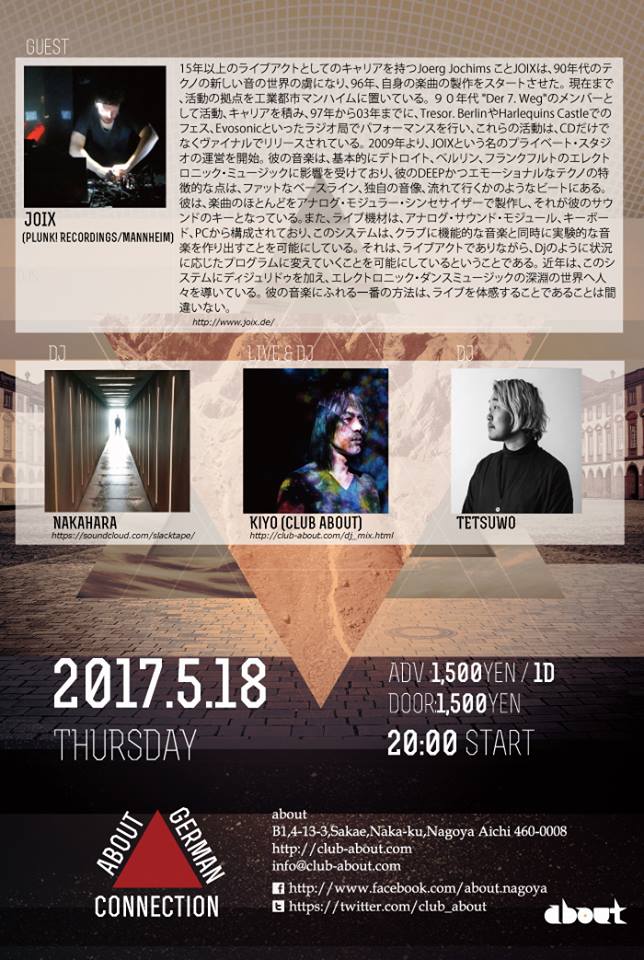 名古屋アンダーグラウンドクラブ aboutの owner / DJ 90年代後半 青山Loop・maniac love にインスピレーションを受け99年DJ活動を開始。 心地よいディープハウス・ミニマルテクノを主体としながら、 時にテック・プログレッシブサウンドでフロアをロックする。 99年DJ活動開始直後から数々のクラブパーティ・野外パーティをオーガナイズ/参加。 09年、club aboutをOPEN。名古屋ハウス・テクノシーンを牽引する第一人者。