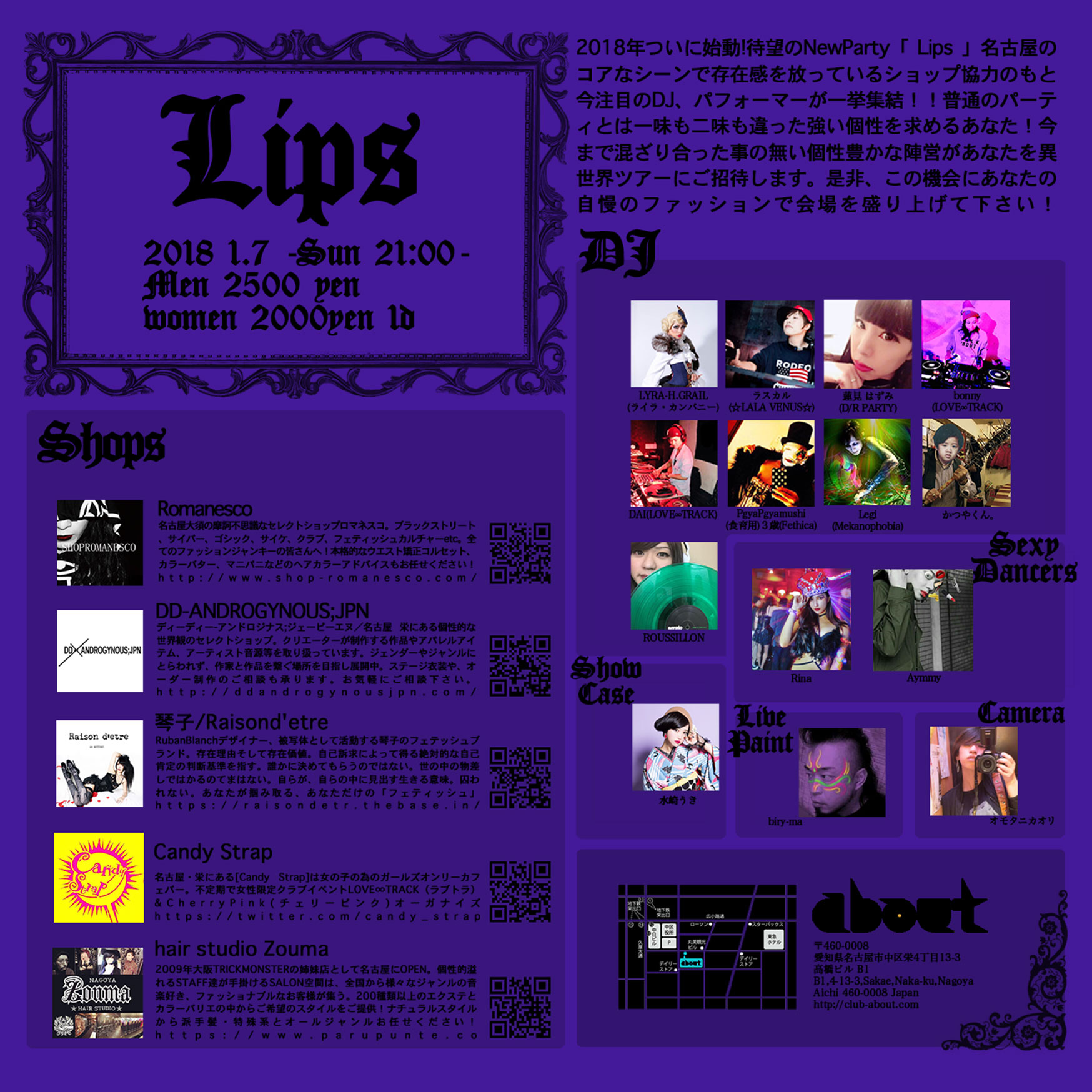 2018年ついに始動!待望のNewParty「 Lips 」名古屋のコアなシーンで存在感を放っているショップ協力のもと今注目のDJ、パフォーマーが一挙集結!!普通のパーティとは一味も二味も違った強い個性を求めるあなた!今まで混ざり合った事の無い個性豊かな陣営があなたを異世界ツアーにご招待します。是非、この機会にあなたの自慢のファッションで会場を盛り上げて下さい!