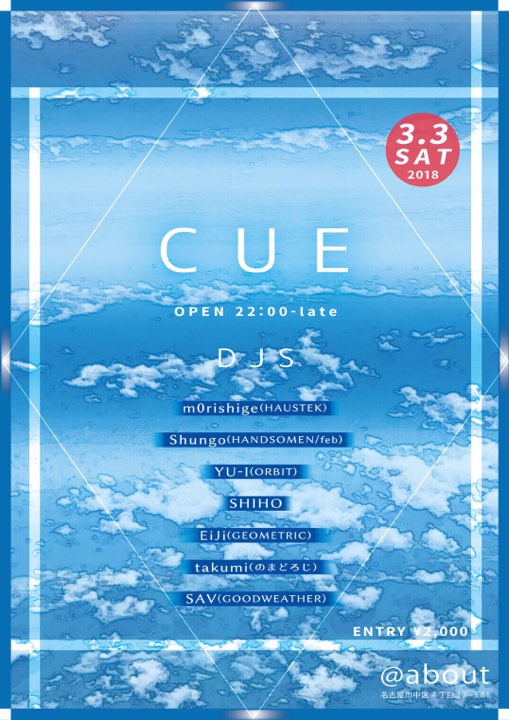 HANDSOMEN/febのShungoとORBITのYU-Iによるコラボparty「CUE」。前回のLEVEL8から会場をclub aboutに移し、今回は純粋に音とdanceを追求するためclubにて開催。 ゲストDJは、'89にNYの有名clubなどで数々のプレイ経験を持ち、現在はマンモスクラブ「iDcafe」の毎週土曜2Fにて開催中の良質なHouseTechnoParty「HAUSTEK」のレジデントDJ&プロデュースを務めるMORISHIGEを迎え、サポートDJにclub JB'sにて月1で様々なアーティストを招致し開催される「GEOMETRIC」主宰EIJIを始め、豊橋のclub Quarkにて6年目に突入する男気溢れるtechno party 「のまどろじ」主宰TAKUMIに、様々なpartyに出演し、どの時間帯でもベストをこなすベテランDJ SHIHO、 その日のpartyの方向を左右するとても重要なオープニングDJとして絶大な信頼を置けるDJ SAVに加え、「CUE」のresidentとしてYU-IとShungoにて脇を固めます。 ありそうで無かったクセのあり過ぎるDJばかり出演するparty、みなさま是非ともお待ちしております!