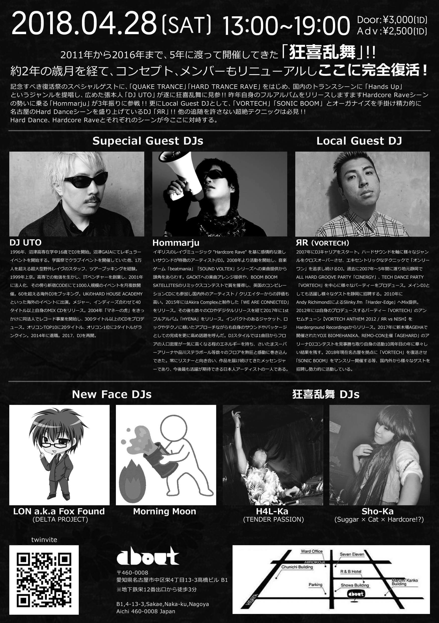 2011年から2016年まで、5年に渡って開催してきた「狂喜乱舞」!! 約2年の歳月を経て、コンセプト、メンバーもリニューアルし ここに完全復活!! 記念すべき復活祭のスペシャルゲストに、「QUAKE TRANCE」「HARD TRANCE RAVE」 をはじめ、国内のトランスシーンに「Hands Up」というジャンルを提唱し、広めた張本人 「DJ UTO」が遂に狂喜乱舞に見参!! 昨年自身のフルアルバムをリリースし ますますHardcore Raveシーンの勢いに乗る「Hommarju」が3年振りに参戦!! 更にLocal Guest DJとして、「VORTECH」「SONIC BOOM」とオーガナイズを手掛け 精力的に名古屋のHard Danceシーンを盛り上げているDJ「ЯR」!! 他の追随を許さない超絶テクニックは必見!! Hard Dance、Hardcore Raveとそれぞれのシーンが今ここに対峙する