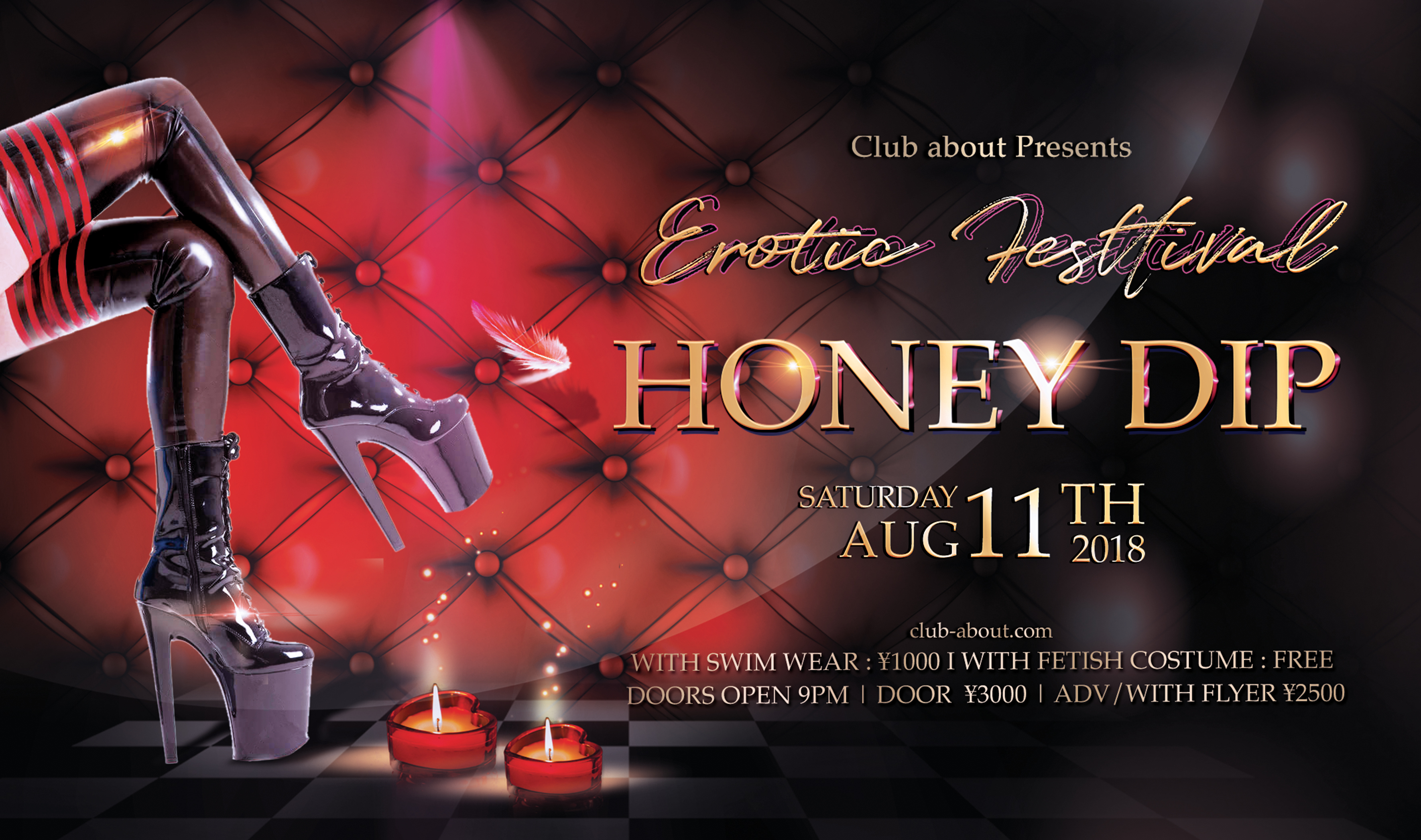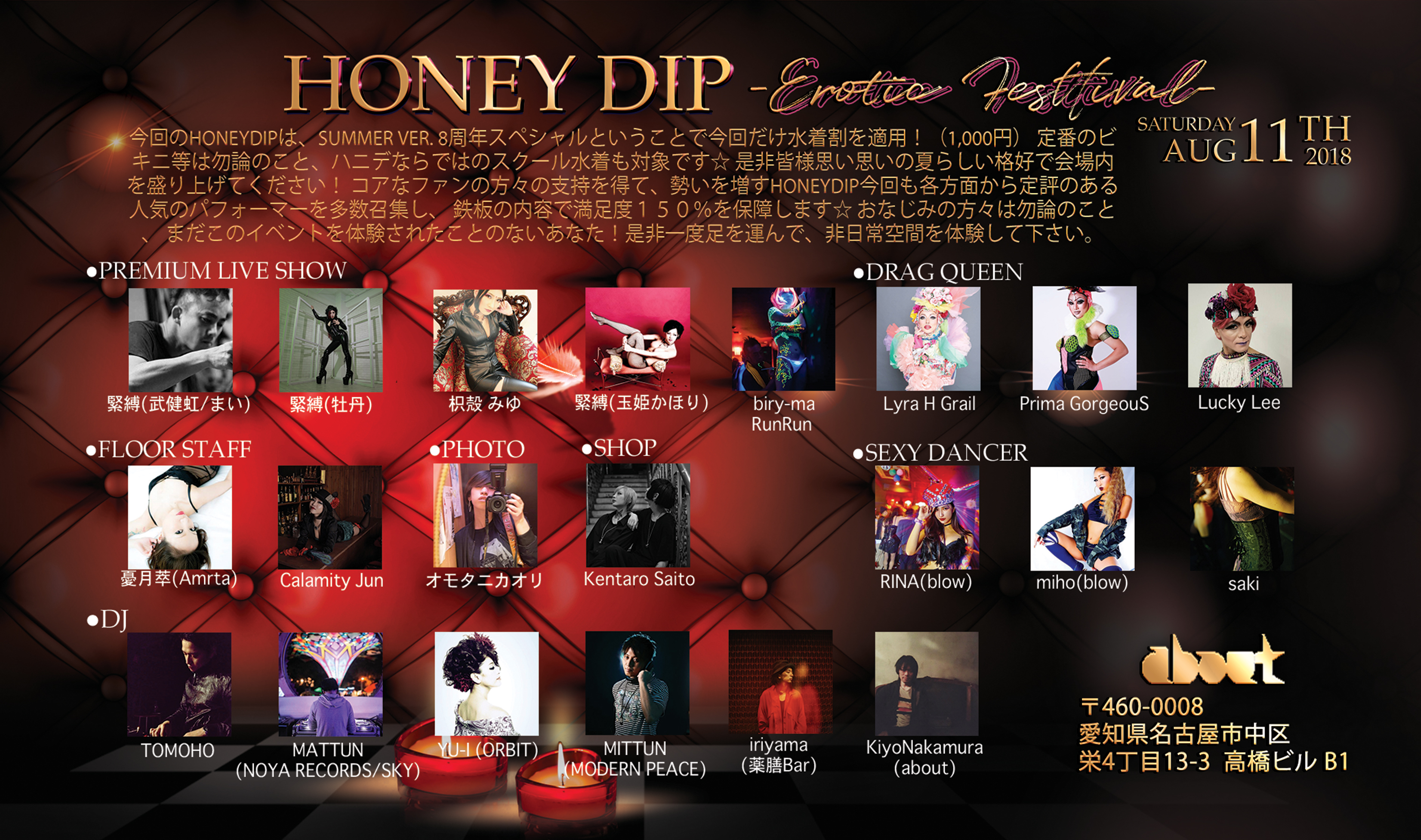 今回のHoneyDipは、summer ver. 8周年スペシャルということで水着割を適用!(1,000円) 定番のビキニ等は勿論のこと、ハニデならではのスクール水着も対象です☆ 是非皆様思い思いの夏らしい格好で会場内を盛り上げてください! コアなファンの方々の支持を得て、勢いを増すHoneyDip今回も各方面から定評のある人気のパフォーマーを多数召集し、 鉄板の内容で満足度150%を保障します☆ おなじみの方々は勿論のこと、 まだこのイベントを体験されたことのないあなた!是非一度足を運んで、非日常空間を体験して下さい。