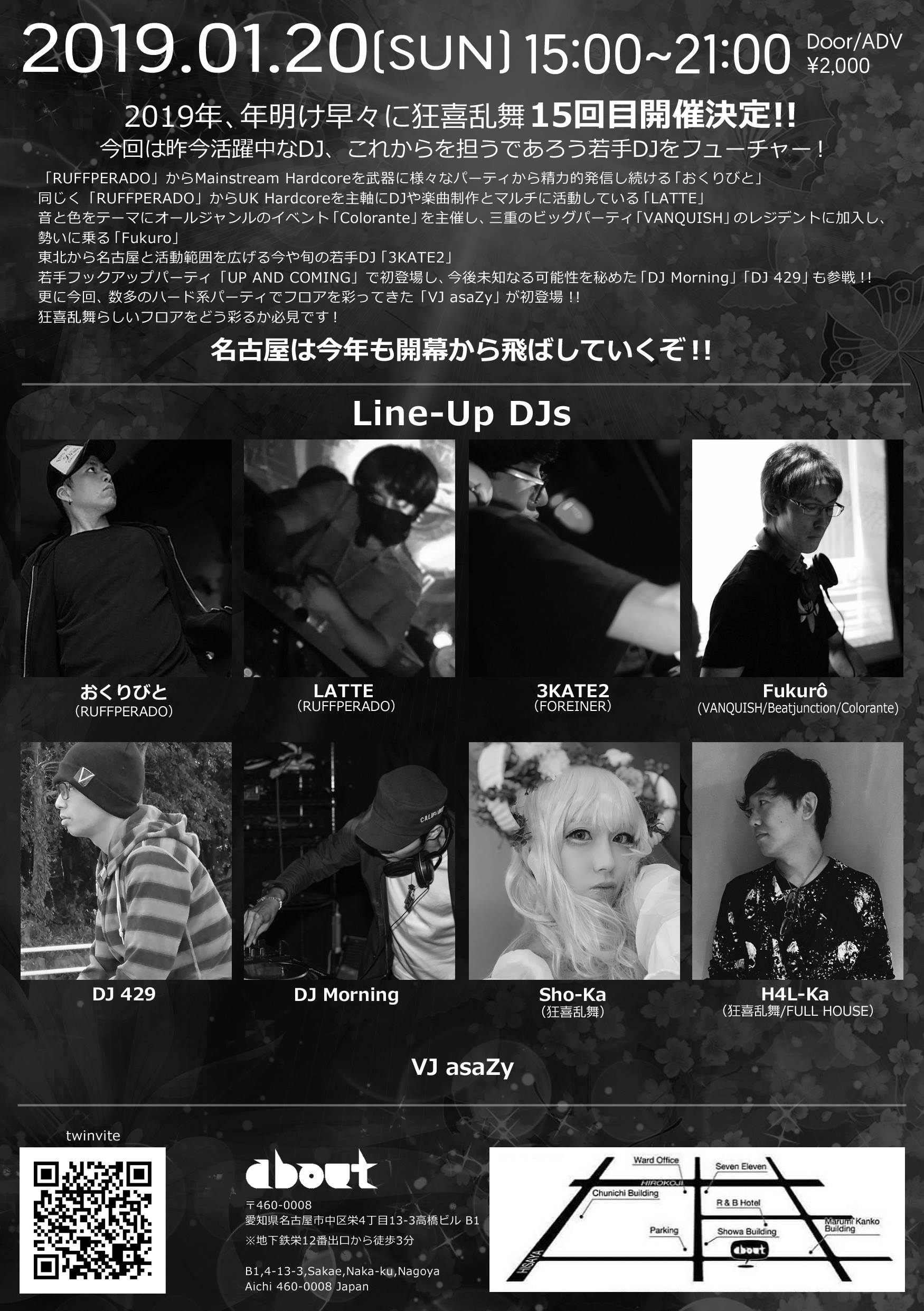 2019年、年明け早々に狂喜乱舞15回目開催決定!! 今回は昨今活躍中なDJ、これからを担うであろう若手DJをフューチャー! 「RUFFPERADO」からMainstream Hardcoreを武器に様々なパーティから精力的発信し続ける「おくりびと」 同じく「RUFFPERADO」から UK Hardcoreを主軸にDJや楽曲制作とマルチに活動している「LATTE」 音と色をテーマにオールジャンルのイベント「Colorante」を主催し、三重のビッグパーティ「VANQUISH」のレジデントに加入し、勢いに乗る「Fukur?」 東北から名古屋と活動範囲を広げる今や旬の若手DJ「3KATE2」 若手フックアップパーティ「UP AND COMING」で初登場し、今後未知なる可能性を秘めた「DJ Morning」「DJ 429」も参戦!! 更に今回、数多のハード系パーティでフロアを彩ってきた「VJ asaZy」が初登場!! 狂喜乱舞らしいフロアをどう彩るか必見です! 名古屋は今年も開幕から飛ばしていくぞ!!