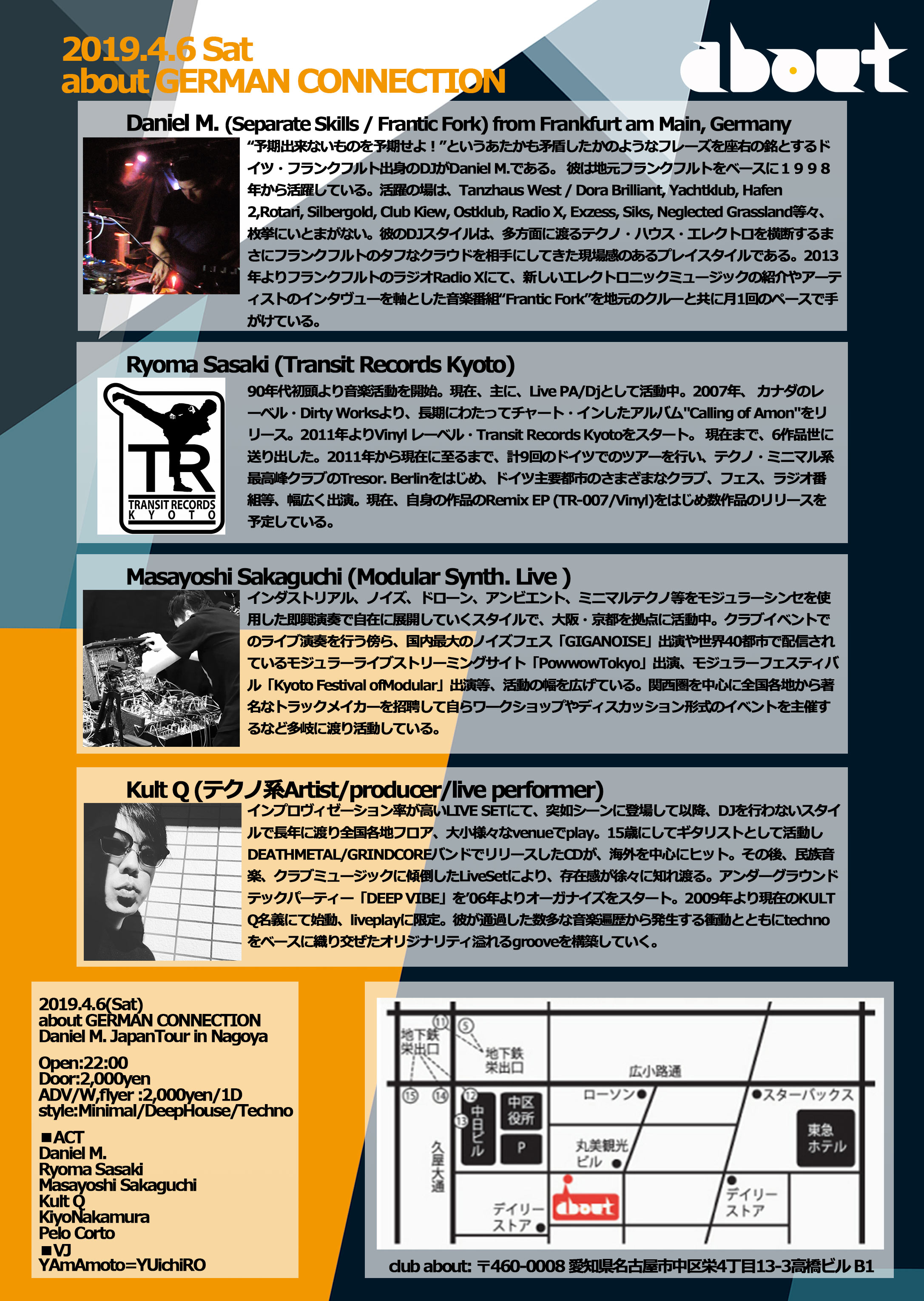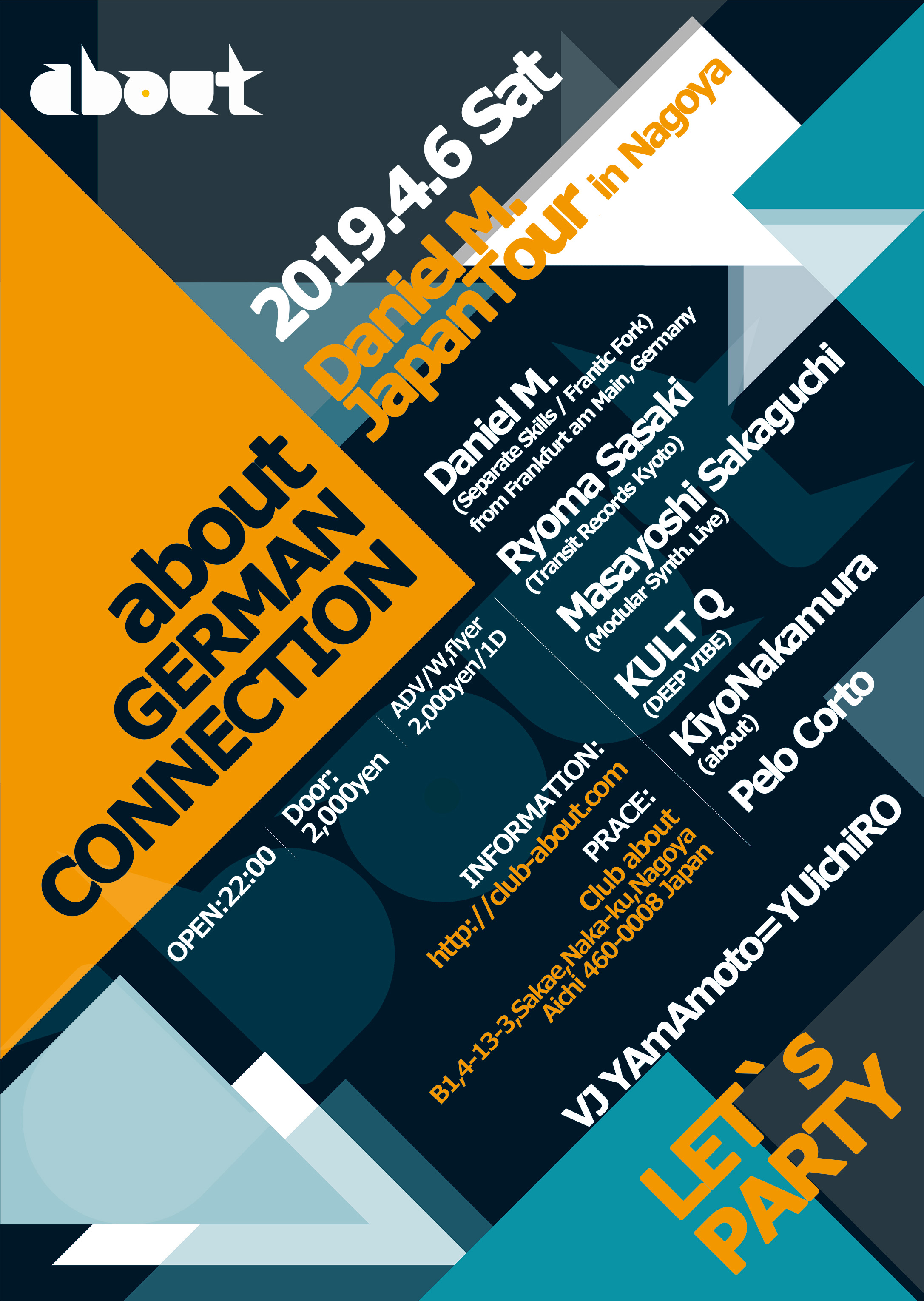 09年、club aboutをOPEN。2017年ドイツツアーを決行。2018年本格的にトラック製作を開始。これまで、MINILOGUE,Derrick May,The Orb,Peter Van Hoesen,JPLS等、多数のアーティストを招いている。