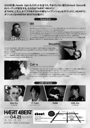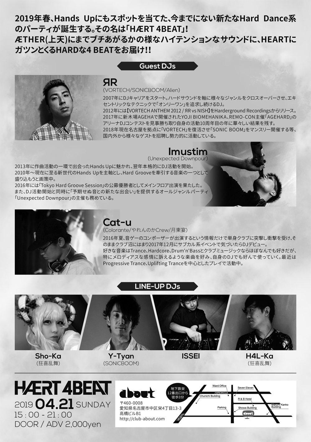 2019年春、Hands Upにもスポット を当てた、今までにない新たなHard Dance系のパーティが誕生する。 その名は「HART 4BEAT」! ATHER(上天)にまでブチあがるかの様なハイテンションなサウンドに、HEARTにガツンとくるHARDな4 BEATをお届け!!