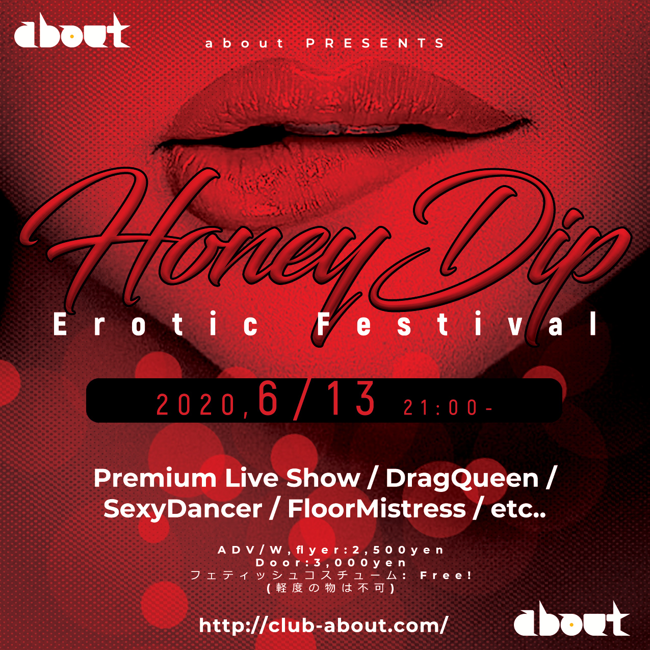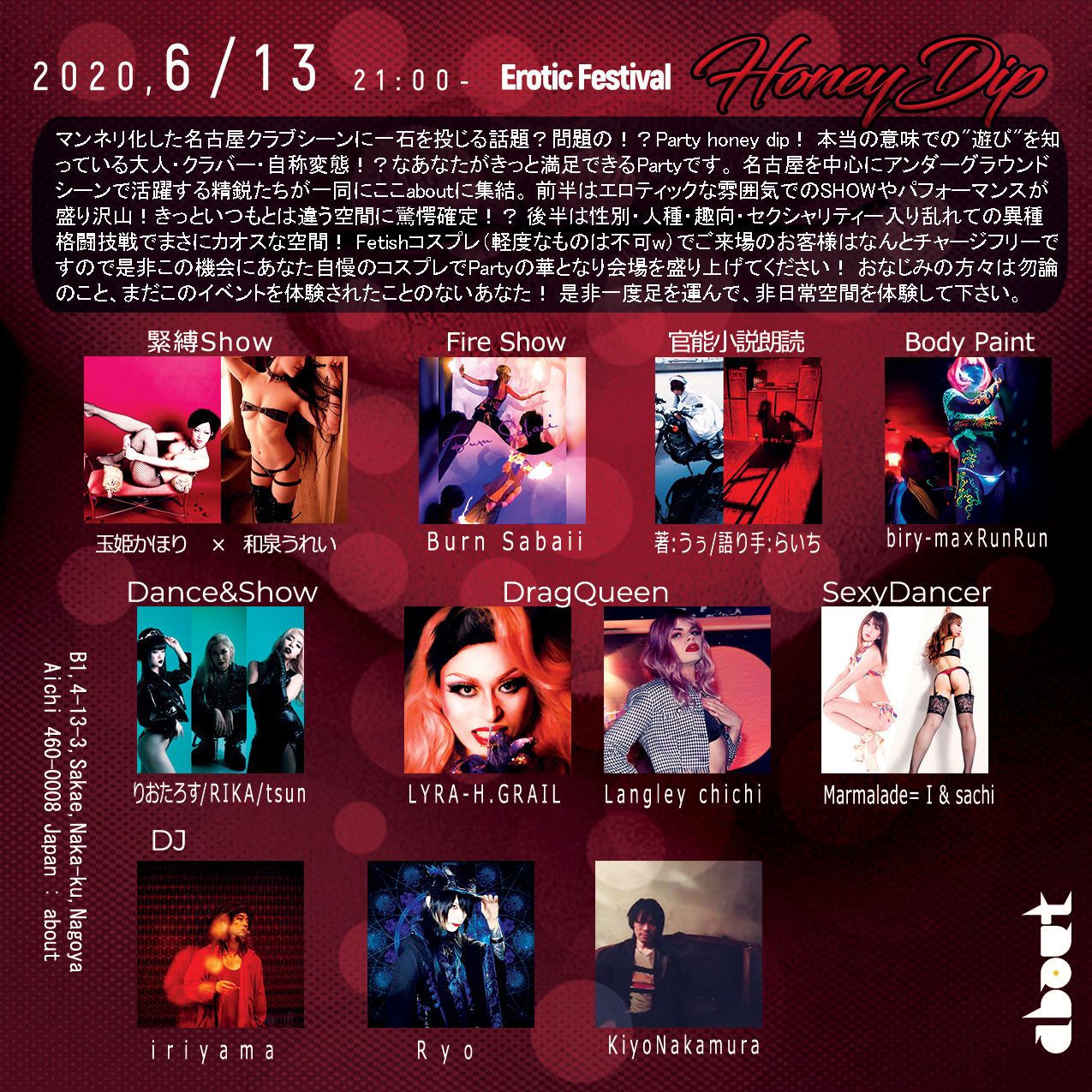 マンネリ化した名古屋クラブシーンに一石を投じる話題?問題の!?Party honey dip! 本当の意味での"遊び"を知っている大人・クラバー・自称変態!?なあなたがきっと満足できるPartyです。 名古屋を中心にアンダーグラウンドシーンで活躍する精鋭たちが一同にここaboutに集結。 前半はエロティックな雰囲気でのSHOWやパフォーマンスが盛り沢山!きっといつもとは違う空間に驚愕確定!? 後半は性別・人種・趣向・セクシャリティー入り乱れての異種格闘技戦でまさにカオスな空間! Fetishコスプレ(軽度なものは不可w)でご来場のお客様はなんとチャージフリーですので是非この機会にあなた自慢のコスプレでPartyの華となり会場を盛り上げてください! おなじみの方々は勿論のこと、まだこのイベントを体験されたことのないあなた! 是非一度足を運んで、非日常空間を体験して下さい。
