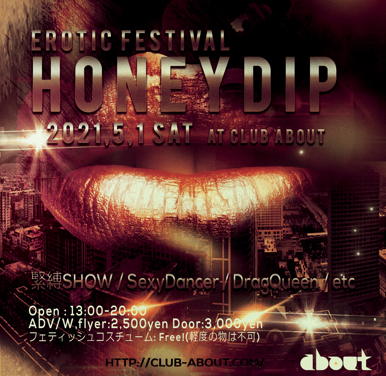 本当の意味での"遊び"を知っている大人・クラバー・自称変態!?なあなたがきっと満足できるPartyです。 名古屋を中心にアンダーグラウンドシーンで活躍する精鋭たちが一同にここaboutに集結。 前半はエロティックな雰囲気でのSHOWやパフォーマンスが盛り沢山!きっといつもとは違う空間に驚愕確定!? 後半は性別・人種・趣向・セクシャリティー入り乱れての異種格闘技戦でまさにカオスな空間! Fetishコスプレ(軽度なものは不可w)でご来場のお客様はなんとチャージフリーですので是非この機会にあなた自慢のコスプレでPartyの華となり会場を盛り上げてください! おなじみの方々は勿論のこと、まだこのイベントを体験されたことのないあなた! 是非一度足を運んで、非日常空間を体験して下さい。