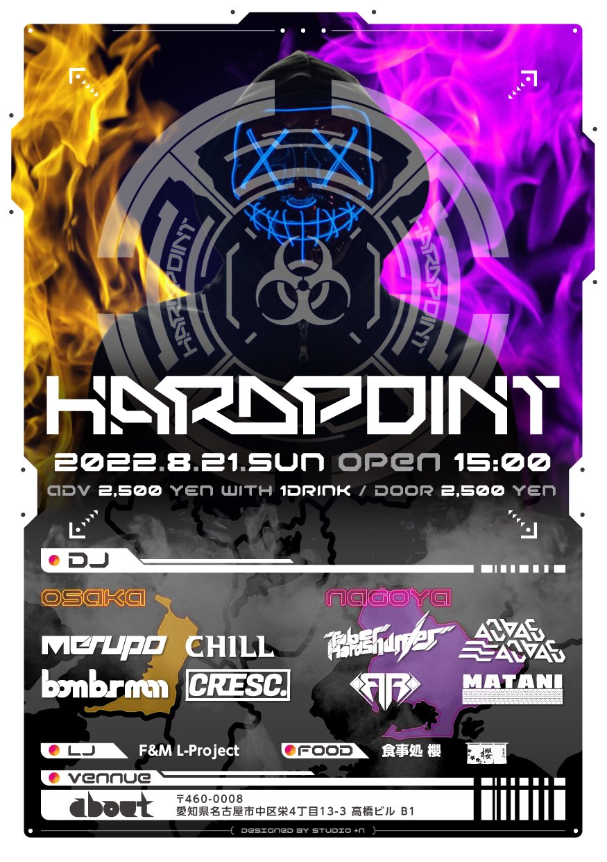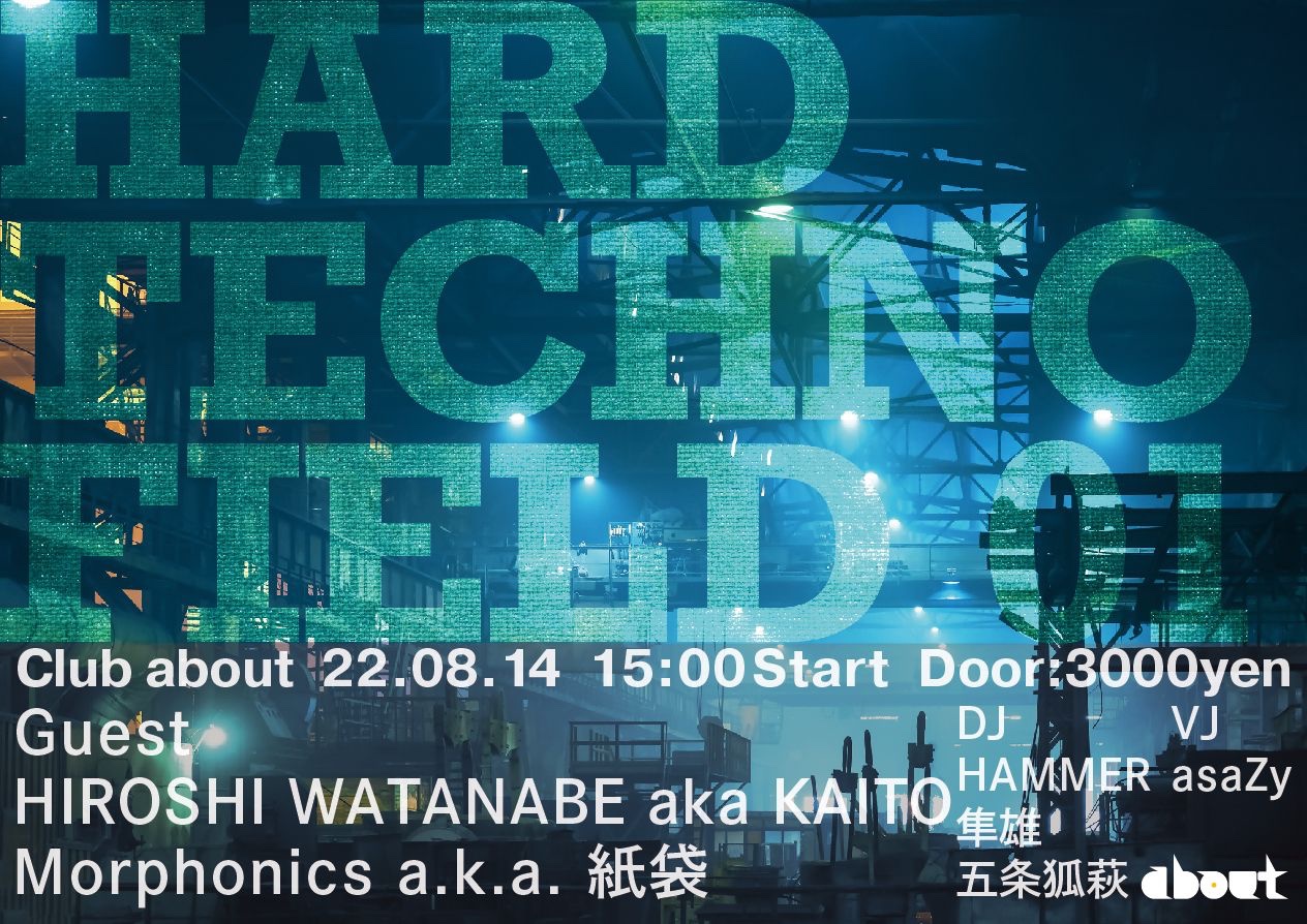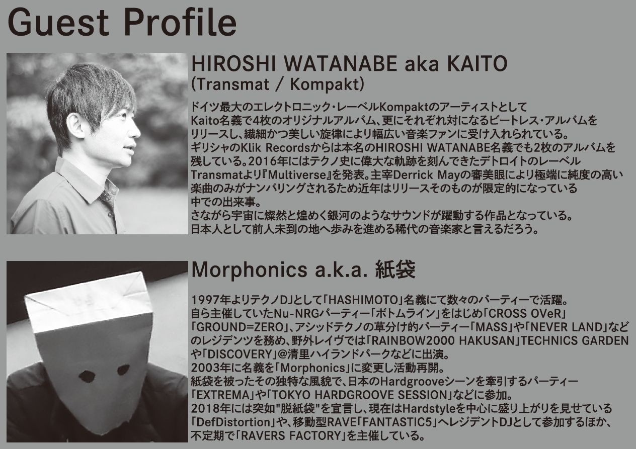 テクノイベント「HARD TECHON FIELD」が久しぶりの開催 今回はゲストにドイツ最大のエレクトロニックレーベルkompaktから多数のリリースをする傍ら、デトロイトのレーベルTransmatからもリリースし前人未到の快挙を成し遂げてきたHIROSHI WATANABEと 1997年よりテクノDJとして「HASHIMOTO」名義にて数々のパーティに出演し2003年に名義を「Morphonics」に変更し活動再開。紙袋を被ったその独特な風貌で、日本のHardgrooveシーンを牽引する2018年には突如"脱紙袋"を宣言し、現在はHardstyleを中心に盛り上がりを見せている 紙袋a.k.a.Morphonicsを迎えミニマルからハードまで幅広いテクノを網羅したお盆の6時間テクノ祭りを開催