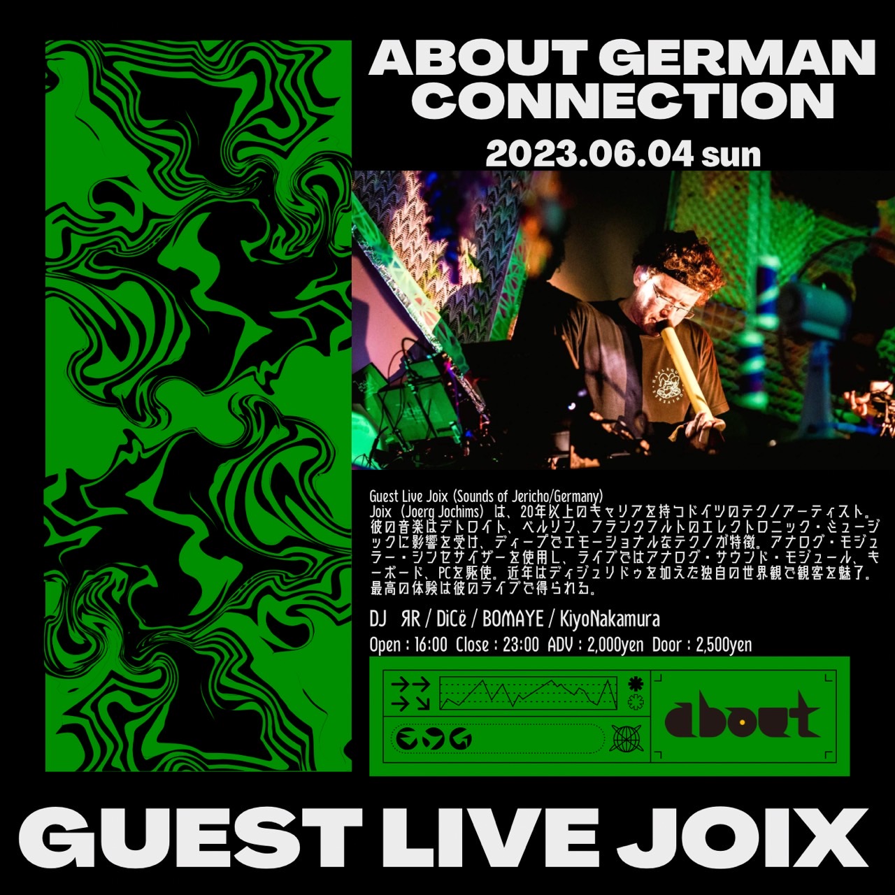 Joix(Joerg Jochims)は、20年以上のキャリアを持つドイツのテクノアーティスト。彼の音楽はデトロイト、ベルリン、フランクフルトのエレクトロニック・ミュージックに影響を受け、ディープでエモーショナルなテクノが特徴。アナログ・モジュラー・シンセサイザーを使用し、ライブではアナログ・サウンド・モジュール、キーボード、PCを駆使。近年はディジュリドゥを加えた独自の世界観で観客を魅了。最高の体験は彼のライブで得られる。