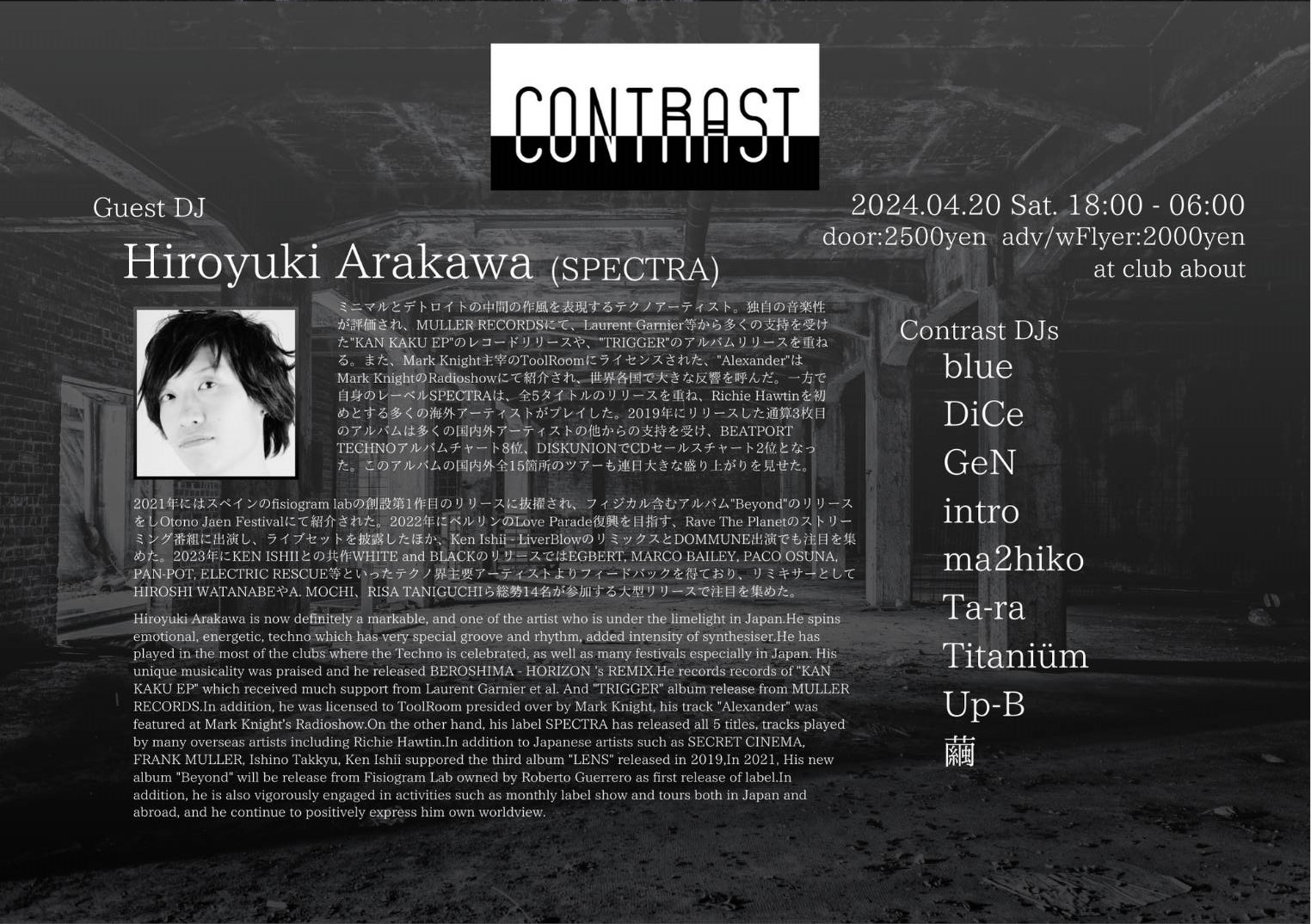 ミニマルとデトロイトの中間の作風を表現するテクノアーティスト。 独自の音楽性が評価され、名門COCOONやSOMA UKにもライセンスされた、BEROSHIMA - HORIZONのREMIXをPIG & DAN、FUNK'D VOID、TIGER SKIN等と共にリリース。 MULLER RECORDSにて、Laurent Garnier等から多くの支持を受けた"KAN KAKU EP"のレコードリリースや、"TRIGGER"のアルバムリリースを重ねる。 また、Mark Knight主宰のToolRoomにライセンスされた、"Alexander"はMark KnightのRadioshowにて紹介され、世界各国で大きな反響を呼んだ。 一方で自身のレーベルSPECTRAは、全5タイトルのリリースを重ね、Richie Hawtinを初めとする多くの海外アーティストがプレイした。 2019年にリリースした通算3枚目のアルバムは石野卓球、砂原良徳、ケンイシイ、ヒロシワタナベ、DRUNKEN KONGといった日本人アーティストの他に、 SECRET CINEMA、FRANK MULLER、Paco Osunaといった国外アーティストからの支持を受け、BEATPORT TECHNOアルバムチャート8位、DISKUNIONでCD セールスチャート2位、AMAZONでダンスミュージックCDセールスチャート49位となった。このアルバムの国内外全15箇所のツアーも連日大きな盛り上がりを見せた。 2021年にはCMYKからリリースを重ねる、Roberto Guerreroのレーベル"fisiogram lab"の創設第1作目のリリースに抜擢され、フィジカル含むアルバム"Beyond"のリリースをし スペインでのOtono Jaen Festivalにて紹介された。 2022年には、Neurojacker - Escape Velocity (hiroyuki arakawa remix)をリリースし、NoirやMarco Baileyと言ったアーティストフィードバック獲得。 同年、ベルリンのLove Parade復興を目指す、Rave The Planetのストリーミング番組に出演し、ライブセットを披露したほか、Ken Ishii - LiverBlowのリミックスと DOMMUNE出演でも注目を集めた。