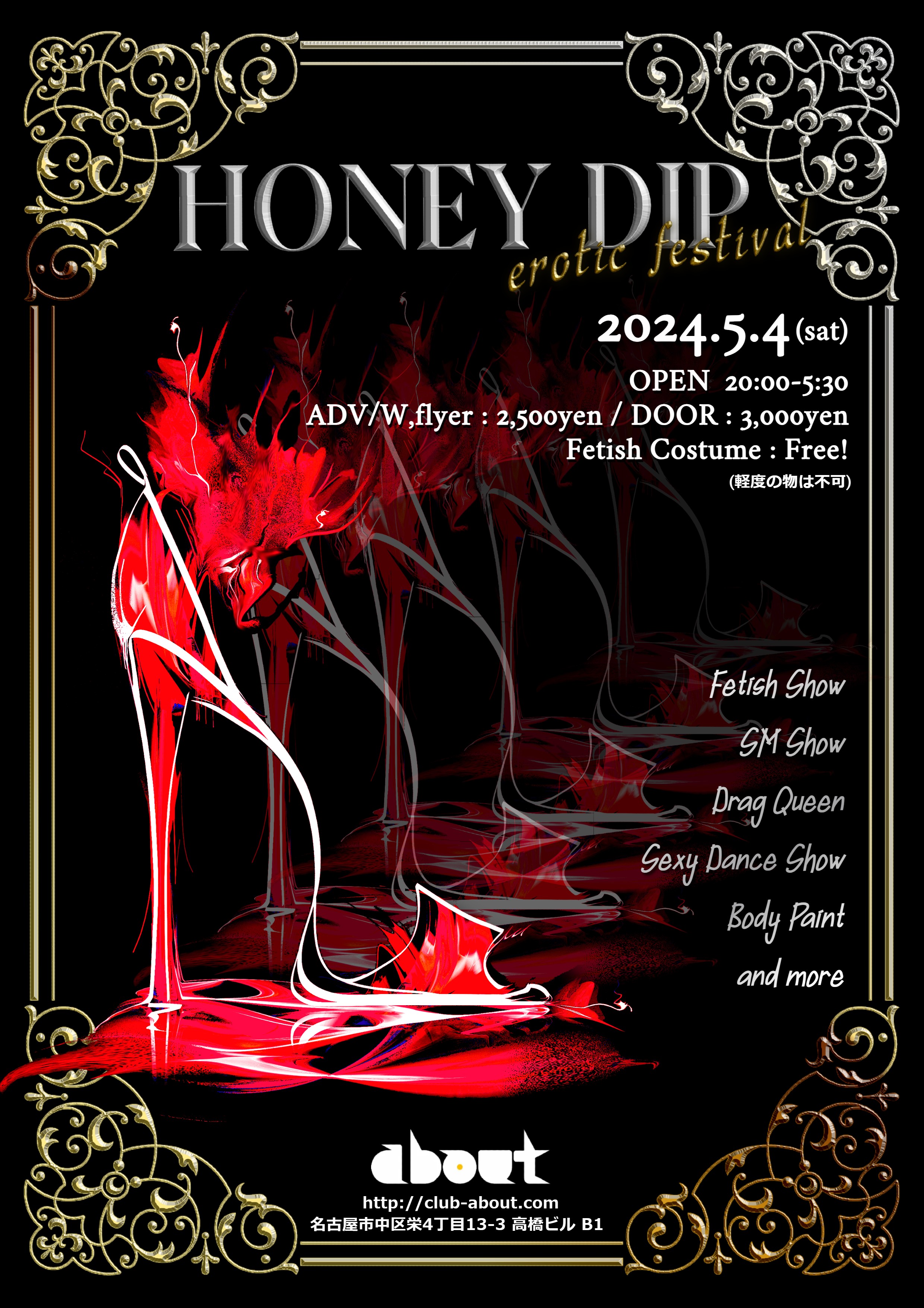 本当の意味での"遊び"を知っている大人・クラバー・自称変態!?なあなたがきっと満足できるPartyです。 名古屋を中心にアンダーグラウンドシーンで活躍する精鋭たちが一同にここaboutに集結。 前半はエロティックな雰囲気でのSHOWやパフォーマンスが盛り沢山!きっといつもとは違う空間に驚愕確定!? 後半は性別・人種・趣向・セクシャリティー入り乱れての異種格闘技戦でまさにカオスな空間! Fetishコスプレ(軽度なものは不可w)でご来場のお客様はなんとチャージフリーですので是非この機会にあなた自慢のコスプレでPartyの華となり会場を盛り上げてください! おなじみの方々は勿論のこと、まだこのイベントを体験されたことのないあなた! 是非一度足を運んで、非日常空間を体験して下さい。