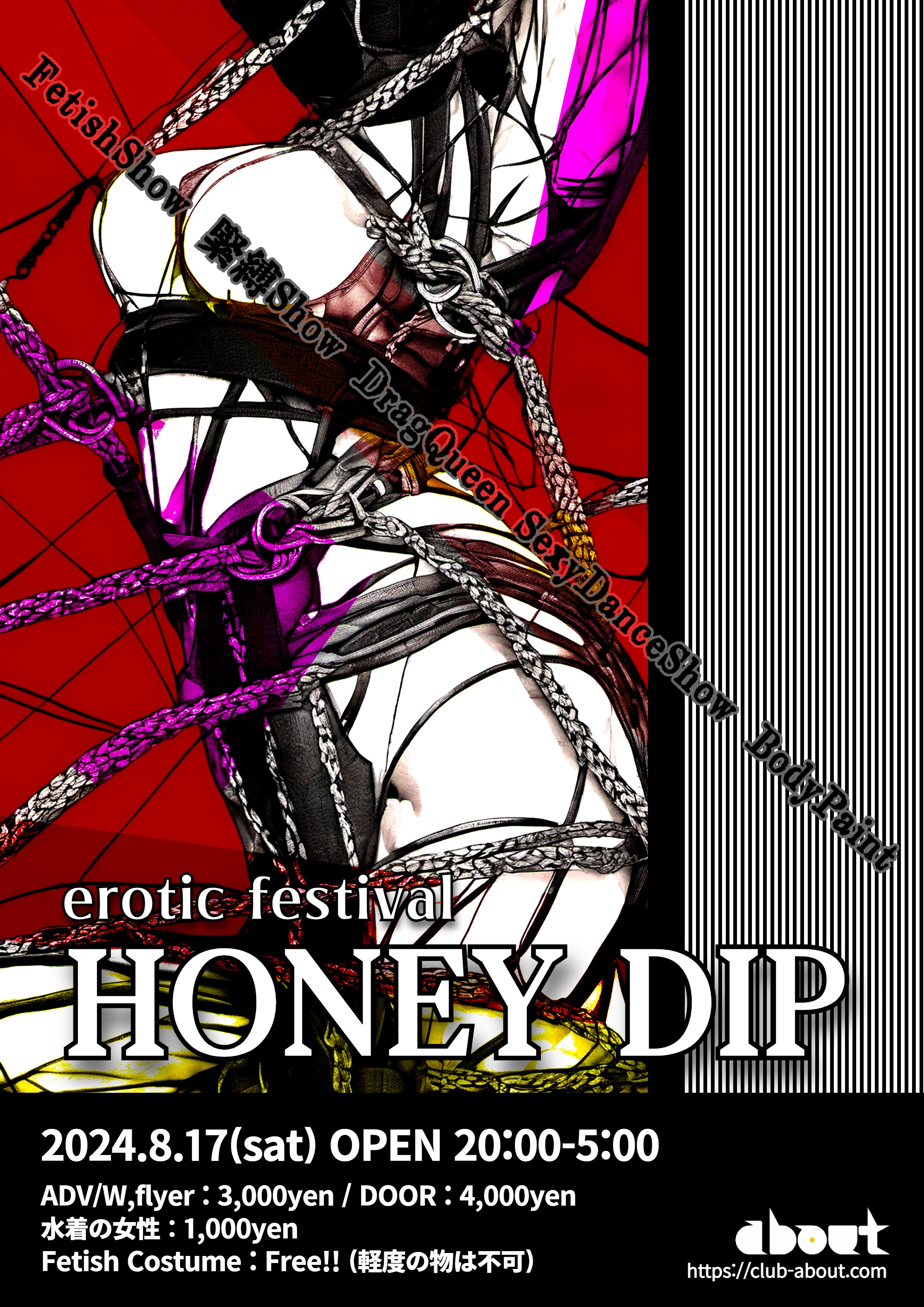 Erotic festival Honey Dip☆毎年恒例!夏のハニデは、水着割を適用!(1,000円) 定番のビキニ等は勿論のこと、ハニデならではのスクール水着も対象です☆ 是非皆様思い思いの夏らしい格好で会場内を盛り上げてください! 本当の意味での"遊び"を知っている大人・クラバー・自称変態!?なあなたがきっと満足できるPartyです。 名古屋を中心にアンダーグラウンドシーンで活躍する精鋭たちが一同にここaboutに集結。 前半はエロティックな雰囲気でのSHOWやパフォーマンスが盛り沢山!きっといつもとは違う空間に驚愕確定!? 後半は性別・人種・趣向・セクシャリティー入り乱れての異種格闘技戦でまさにカオスな空間! Fetishコスプレ(軽度なものは不可w)でご来場のお客様はなんとチャージフリーですので是非この機会にあなた自慢のコスプレでPartyの華となり会場を盛り上げてください! おなじみの方々は勿論のこと、まだこのイベントを体験されたことのないあなた! 是非一度足を運んで、非日常空間を体験して下さい。
