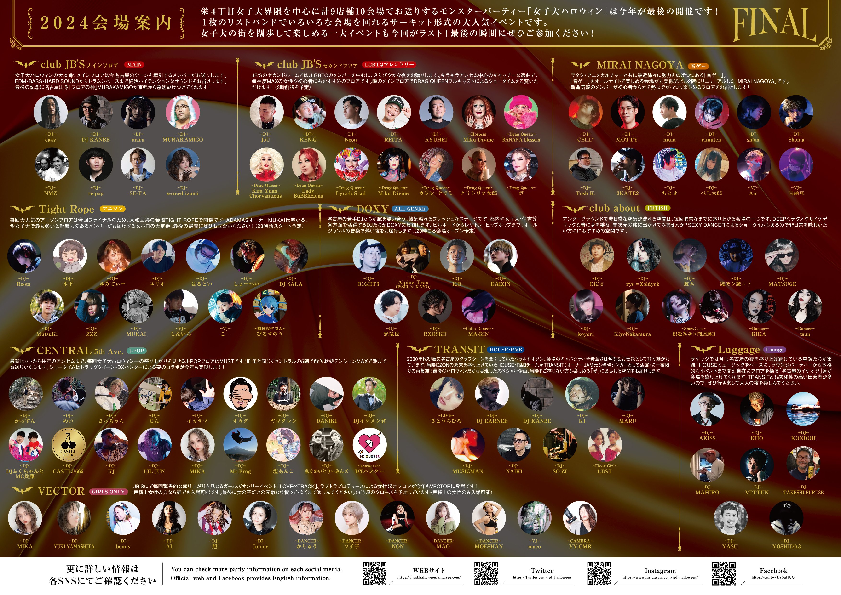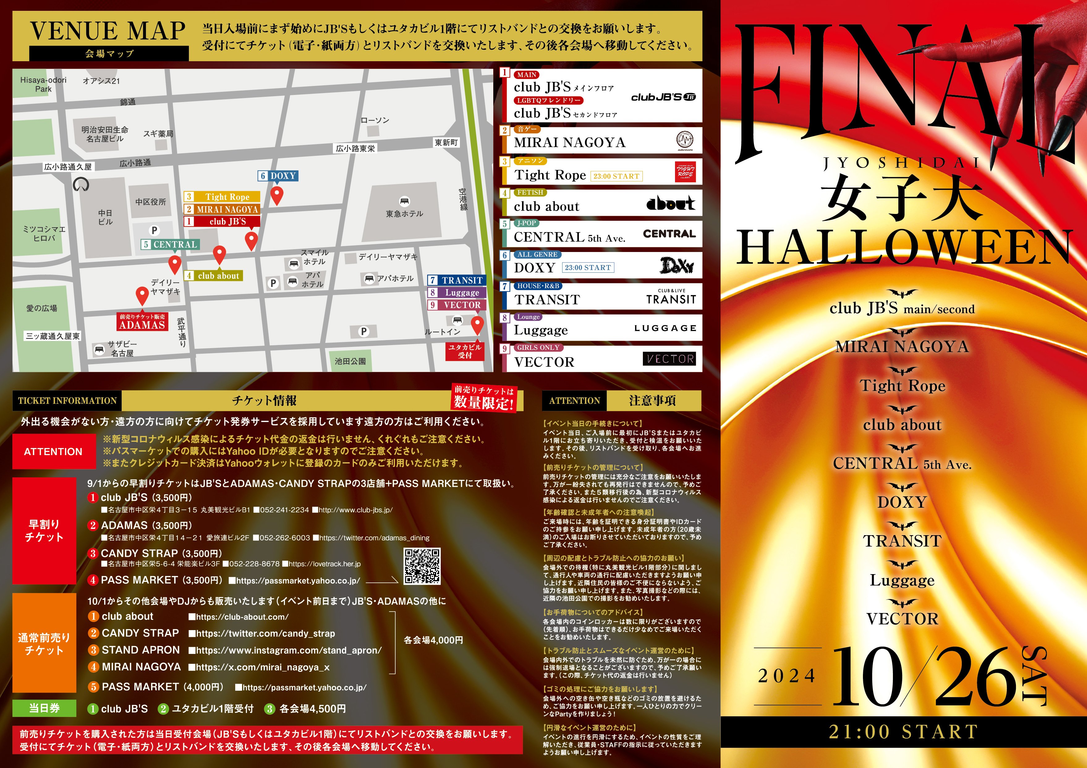 栄4丁目女子大界隈を中心に計9店舗10会場でお送りするモンスターパーティー「女子大ハロウィン」は今年が最後の開催です!1枚のリストバンドで色々な会場を回れるサーキット形式の大人気イベントです。女子大の街を闊歩して楽しめる一大イベントもこれがラスト!最後の瞬間を是非お立ち合い下さい!