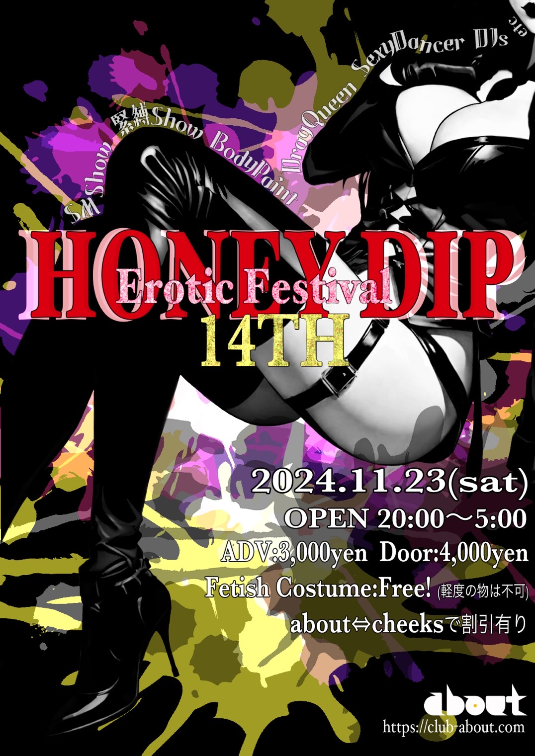 Erotic festival HoneyDip 14周年 開催決定! 本当の意味での"遊び"を知っている大人・クラバー・自称変態!?なあなたがきっと満足できるPartyです。 名古屋を中心にアンダーグラウンドシーンで活躍する精鋭たちが一同にここaboutに集結。 前半はエロティックな雰囲気でのSHOWやパフォーマンスが盛り沢山!きっといつもとは違う空間に驚愕確定!? 後半は性別・人種・趣向・セクシャリティー入り乱れての異種格闘技戦でまさにカオスな空間! Fetishコスプレ(軽度なものは不可w)でご来場のお客様はなんとチャージフリーですので是非この機会にあなた自慢のコスプレでPartyの華となり会場を盛り上げてください! おなじみの方々は勿論のこと、まだこのイベントを体験されたことのないあなた! 是非一度足を運んで、非日常空間を体験して下さい。