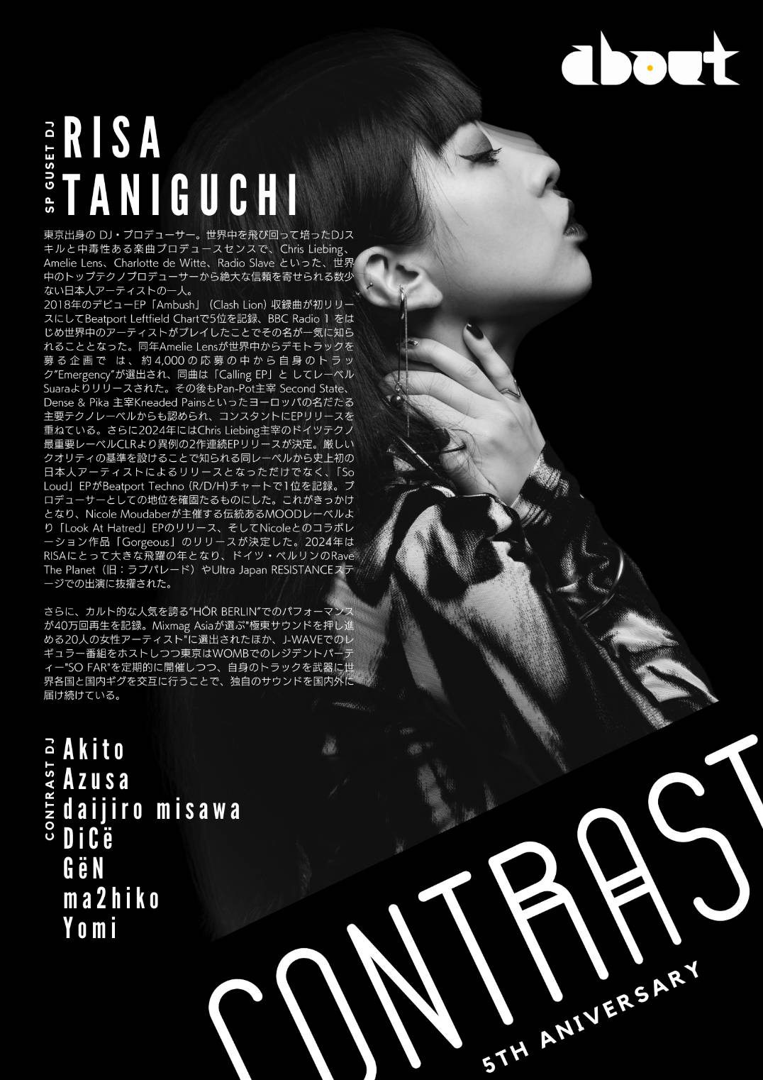 東京出身の DJ・プロデューサー。世界中を飛び回って培ったDJスキルと中毒性ある楽曲プロデュースセンスで、Chris Liebing、Amelie Lens、Charlotte de Witte、Radio Slave といった、世界中のトップテクノプロデューサーから絶大な信頼を寄せられる数少ない日本人アーティストの一人。 2018年のデビューEP「Ambush」 (Clash Lion) 収録曲が初リリースにしてBeatport Leftfield Chartで5位を記録、BBC Radio 1 をはじめ世界中のアーティストがプレイしたことでその名が一気に知られることとなった。同年Amelie Lensが世界中からデモトラックを募る企画で は、約4,000の応募の中から自身のトラック”Emergency”が選出され、同曲は「Calling EP」と してレーベルSuaraよりリリースされた。その後もPan-Pot主宰 Second State、Dense & Pika 主宰Kneaded Painsといったヨーロッパの名だたる主要テクノレーベルからも認められ、コンスタントにEPリリースを重ねている。さらに2024年にはChris Liebing主宰のドイツテクノ最重要レーベルCLRより異例の2作連続EPリリースが決定。厳しいクオリティの基準を設けることで知られる同レーベルから史上初の日本人アーティストによるリリースとなっただけでなく、「So Loud」EPがBeatport Techno (R/D/H)チャートで1位を記録。プロデューサーとしての地位を確固たるものにした。これがきっかけとなり、Nicole Moudaberが主催する伝統あるMOODレーベルより「Look At Hatred」EPのリリース、そしてNicoleとのコラボレーション作品「Gorgeous」のリリースが決定した。2024年はRISAにとって大きな飛躍の年となり、ドイツ・ベルリンのRave The Planet(旧:ラブパレード)やUltra Japan RESISTANCEステージでの出演に抜擢された。 さらに、カルト的な人気を誇る”H?R BERLIN”でのパフォーマンスが40万回再生を記録。Mixmag Asiaが選ぶ"極東サウンドを押し進める20人の女性アーティスト"に選出されたほか、J-WAVEでのレギュラー番組をホストしつつ東京はWOMBでのレジデントパーティー"SO FAR"を定期的に開催しつつ、自身のトラックを武器に世界各国と国内ギグを交互に行うことで、独自のサウンドを国内外に届け続けている。