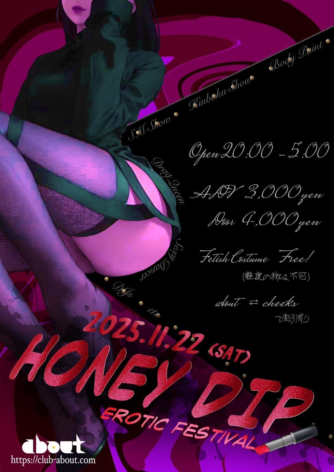 Erotic festival HoneyDip 15周年 開催決定! 本当の意味での"遊び"を知っている大人・クラバー・自称変態!?なあなたがきっと満足できるPartyです。 名古屋を中心にアンダーグラウンドシーンで活躍する精鋭たちが一同にここaboutに集結。 前半はエロティックな雰囲気でのSHOWやパフォーマンスが盛り沢山!きっといつもとは違う空間に驚愕確定!? 後半は性別・人種・趣向・セクシャリティー入り乱れての異種格闘技戦でまさにカオスな空間! Fetishコスプレ(軽度なものは不可w)でご来場のお客様はなんとチャージフリーですので是非この機会にあなた自慢のコスプレでPartyの華となり会場を盛り上げてください! おなじみの方々は勿論のこと、まだこのイベントを体験されたことのないあなた! 是非一度足を運んで、非日常空間を体験して下さい。